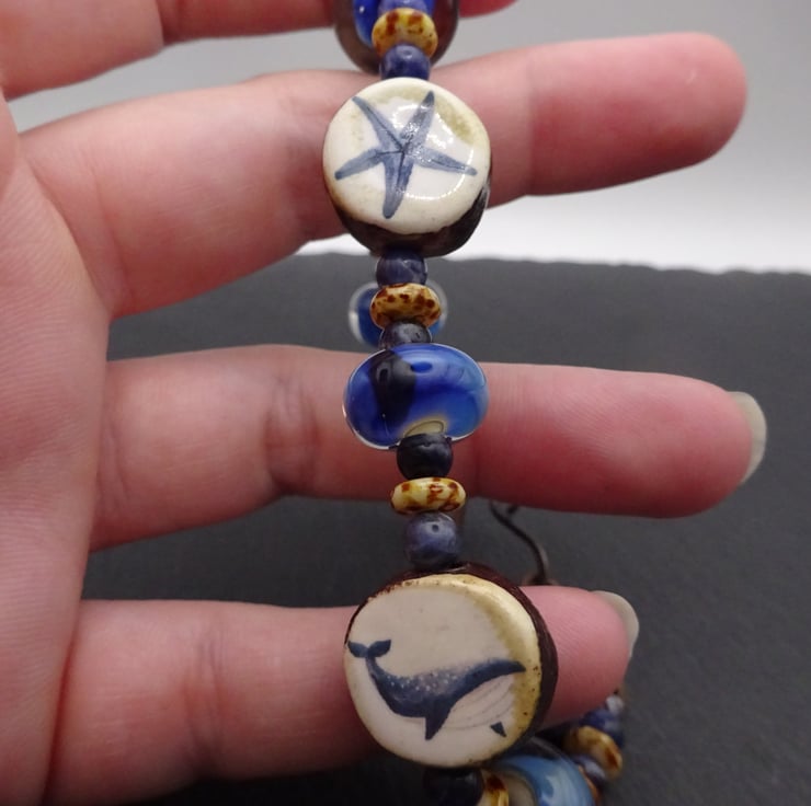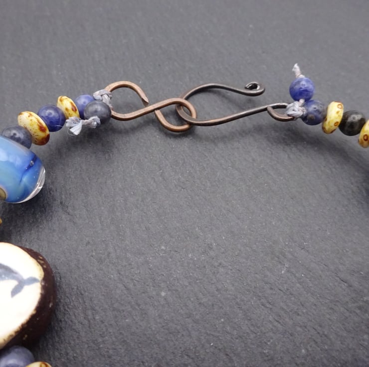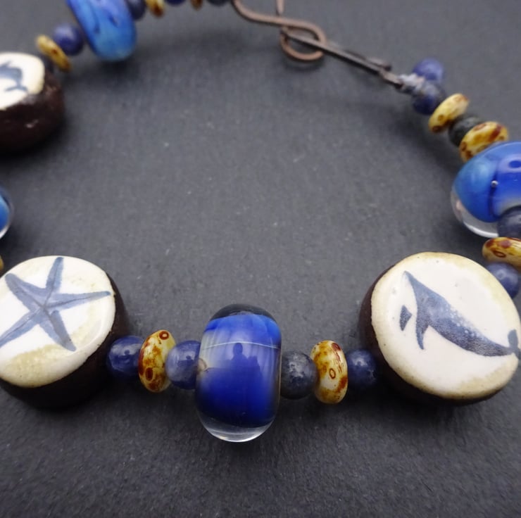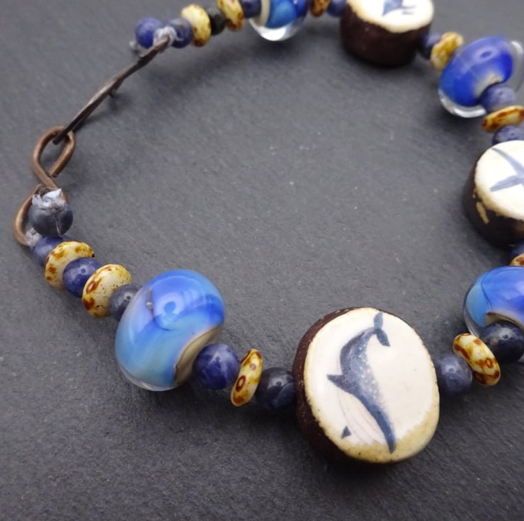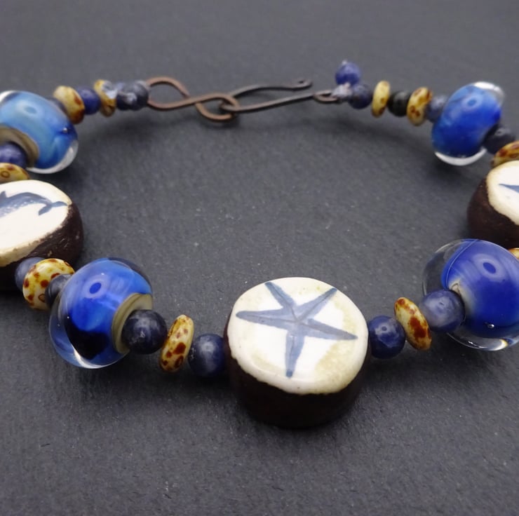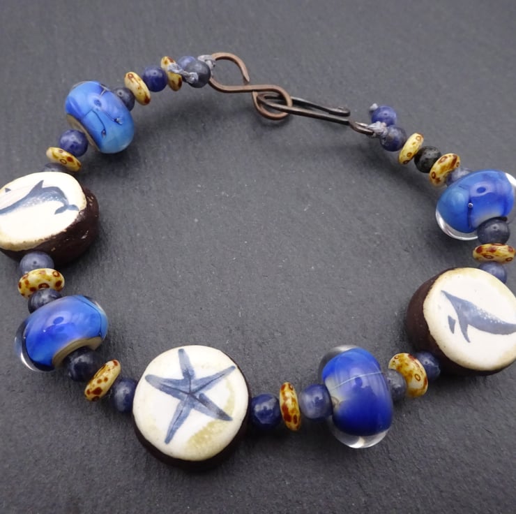 A bracelet made with handmade lampwork glass beads, handmade ceramic beads, cream Czech glass ebads and grade A Sodalite gemstone beads.