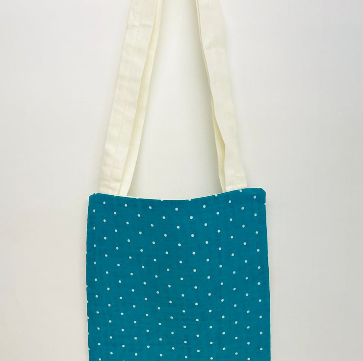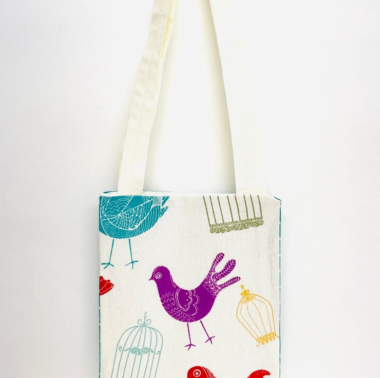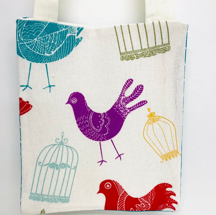 The fabric has colourful birds on the front with a complimentary polkadot fabric on the back , lined with cream cotton fabric.