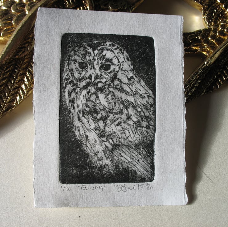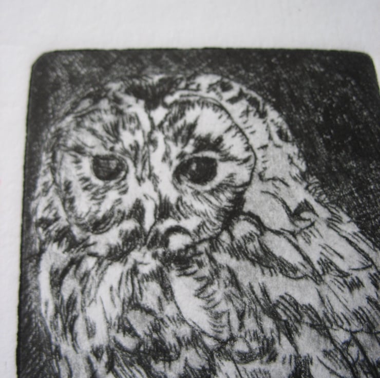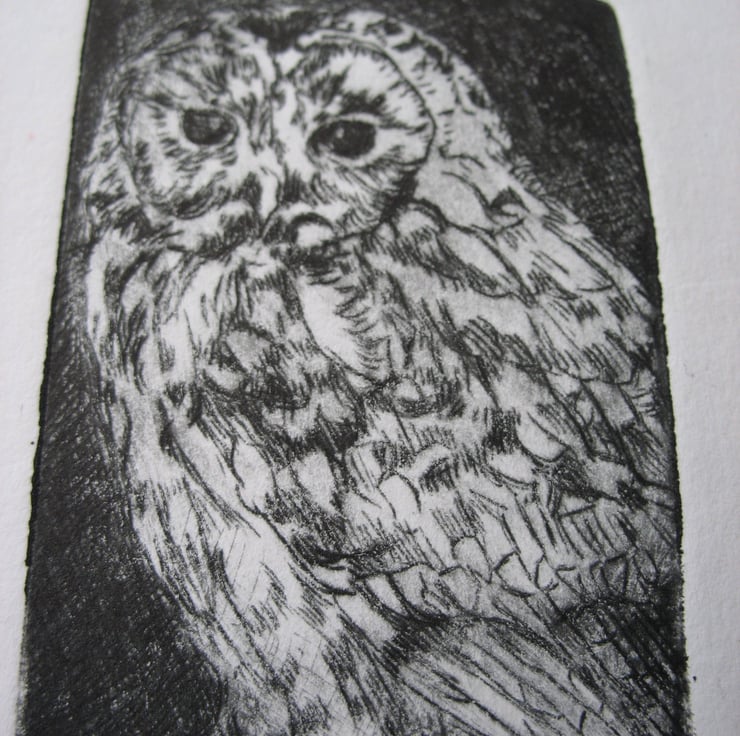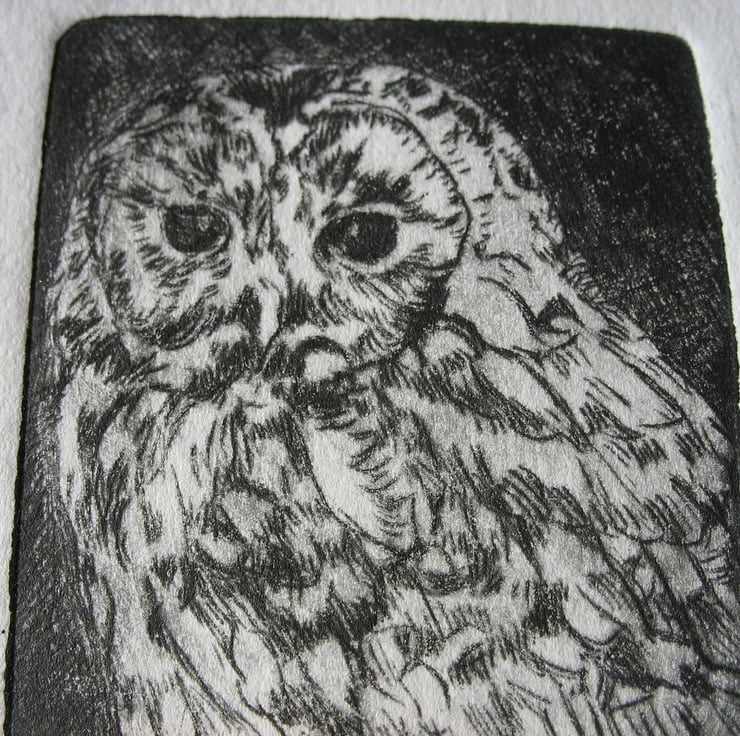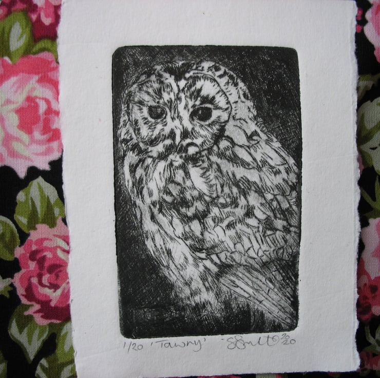This little cuteypie measures approximately 2"x3" . It is a drypoint etching taken from a plexiglass plate which has been scratched into with a fine tool and printed with Akua soya based ink. She is numbered 1 from a limited edition of 20 prints.