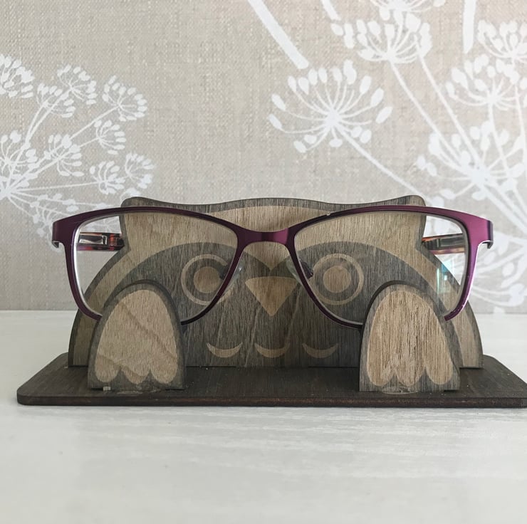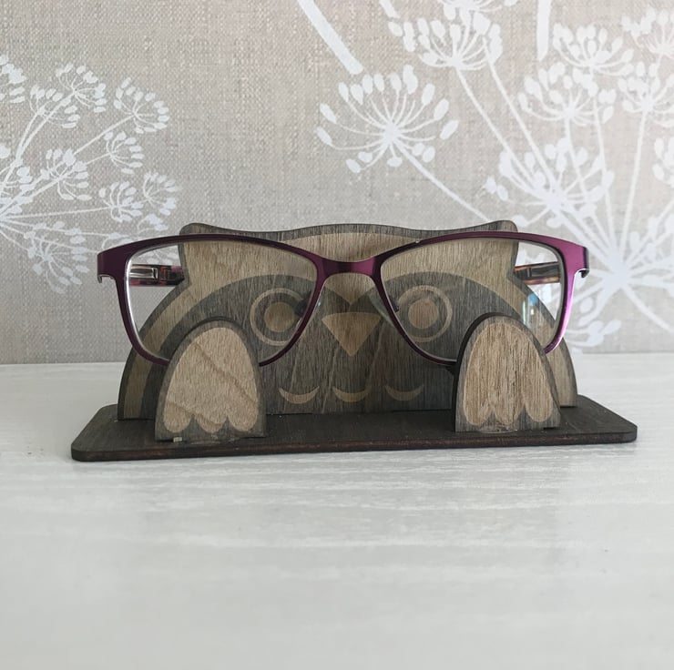 A cute wooden owl made from birch plywood, holds your glasses perfectly while you’re not wearing them