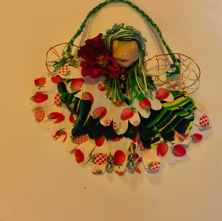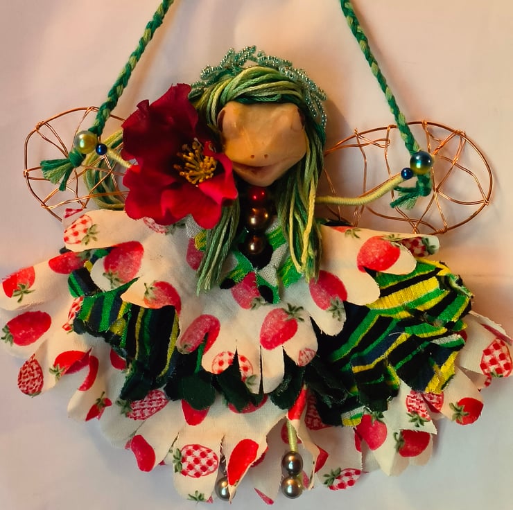 Her wings are also recycled copper wire, her flower skirts are made from fabric that I cut to make them flower petals