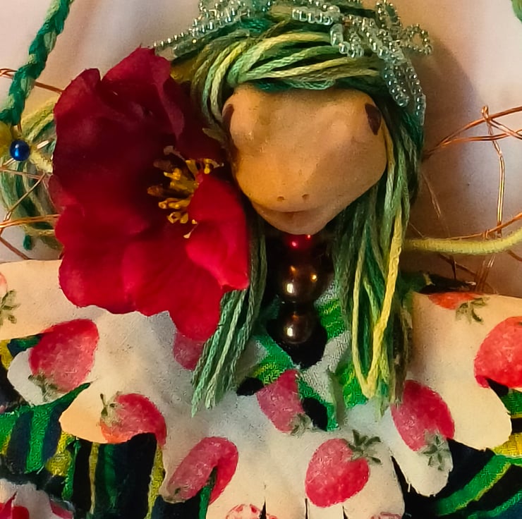 Her body is made from recycled copper wire which I hand strip from electrical cable, which is then shaped and wrapped in cotton thread, her head is a wooden bead which I sculpt the face on out of sculpy clay,
