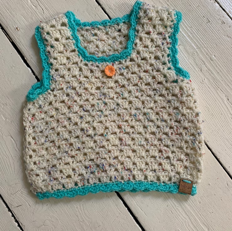 Crochet tank top in acrylic mix yarn - multi fleck with pale blue trim button detailing - size - 24inch/61cm - age 18/24month.