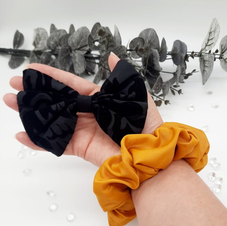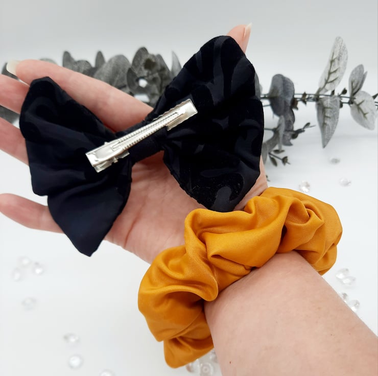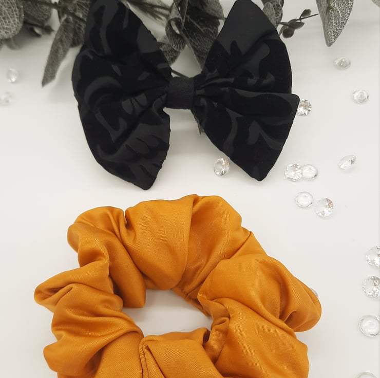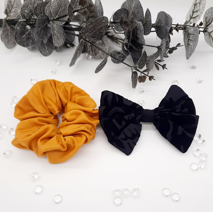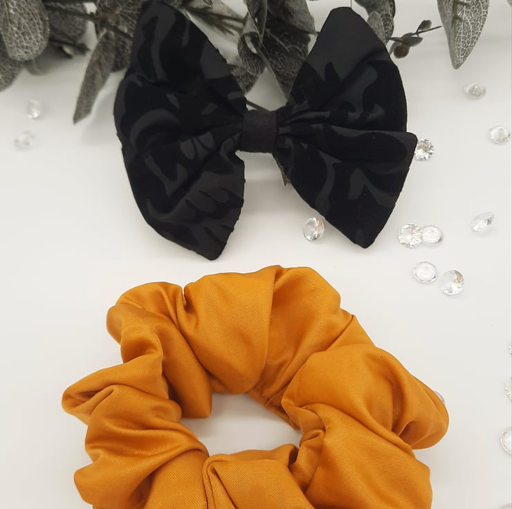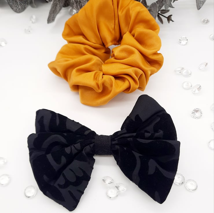 Black damask clip on bow and mustard yellow satin scrunchie.