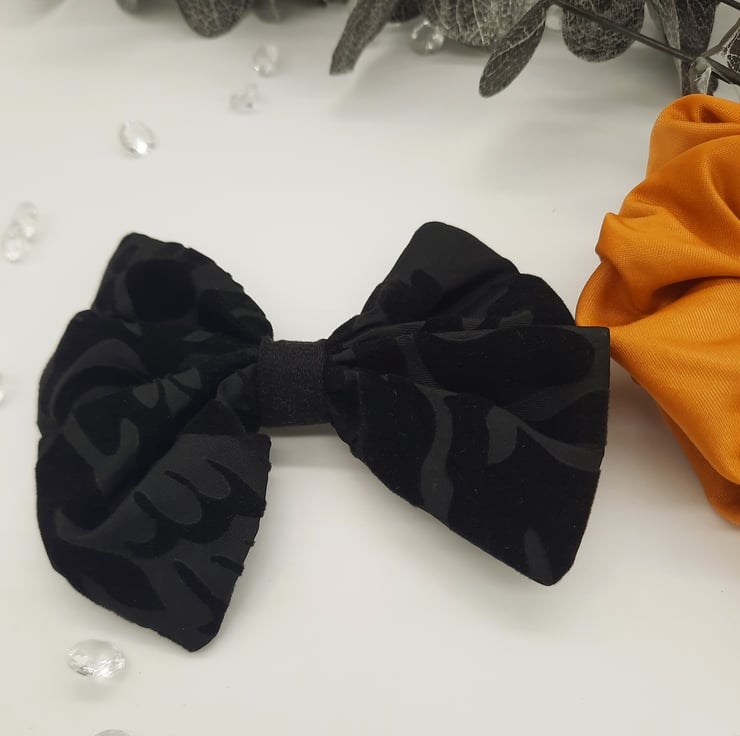 The bow is made from a soft black damask fabric and has a silver colour slide attached to the back. Measures 4.5 " x 4.5 ".