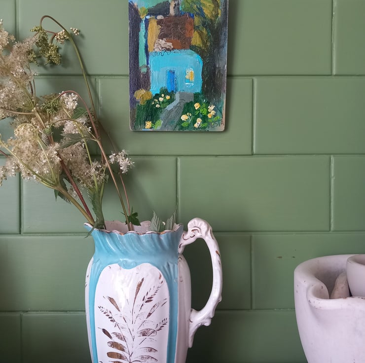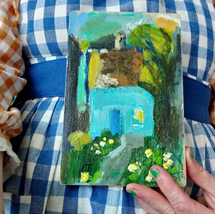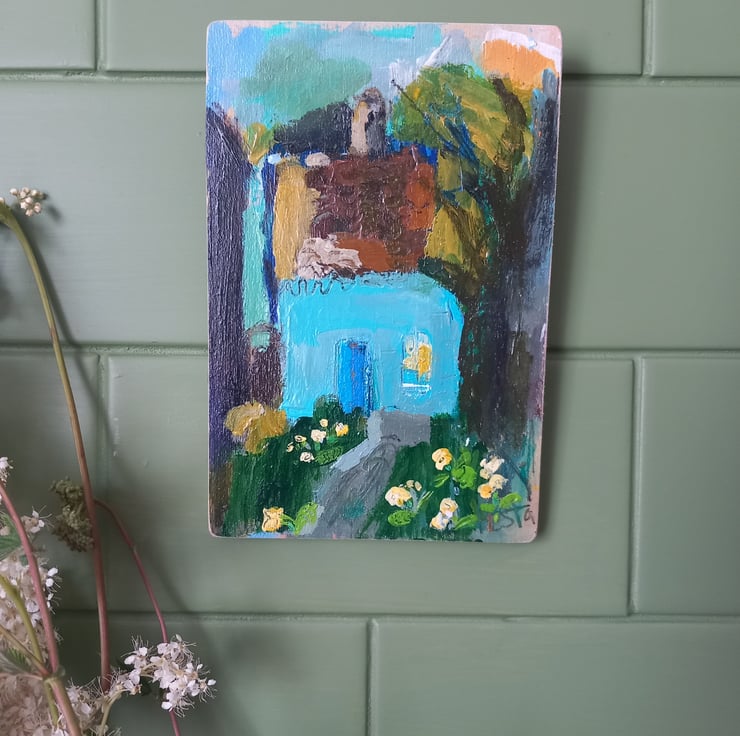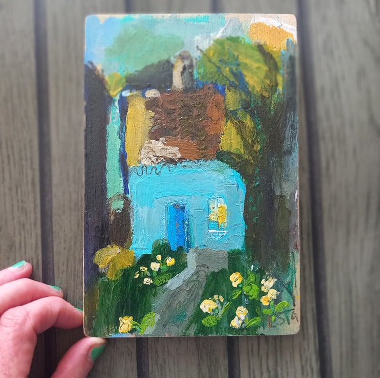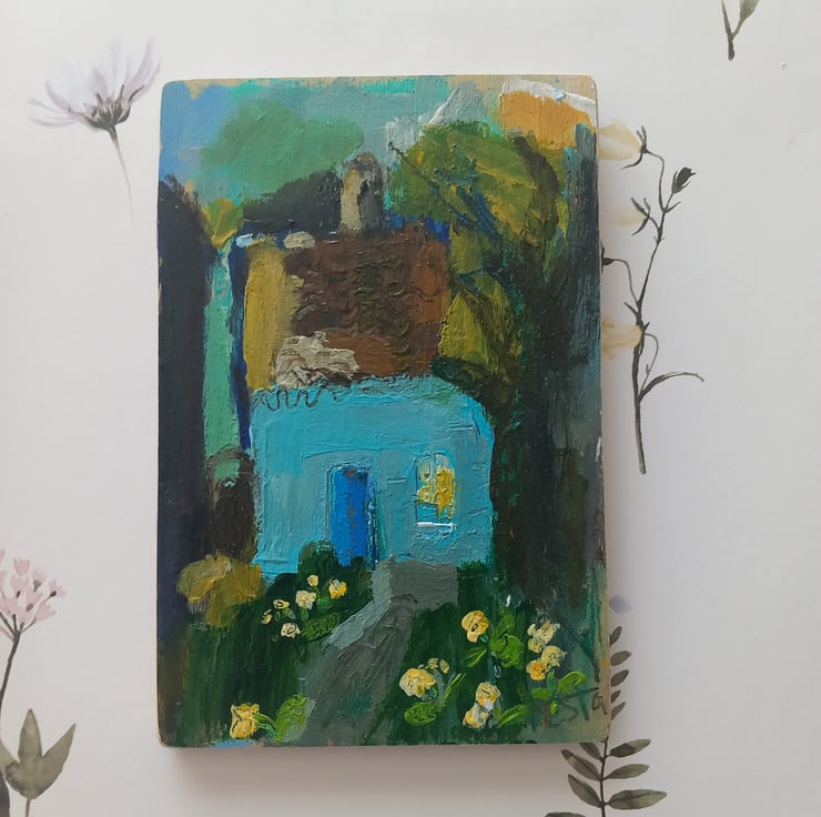 A fairy tale cottage in the woods with primroses on the path. Rich in texture and painted on wood. A magical cottage to hide away, May it bring you calm and a fairytale escape every time to glance at it. 18 cm.tall 12cm wide. Lightly varnished and a hook ready to hang on the back. Come mindfully wrapped. Love hesta