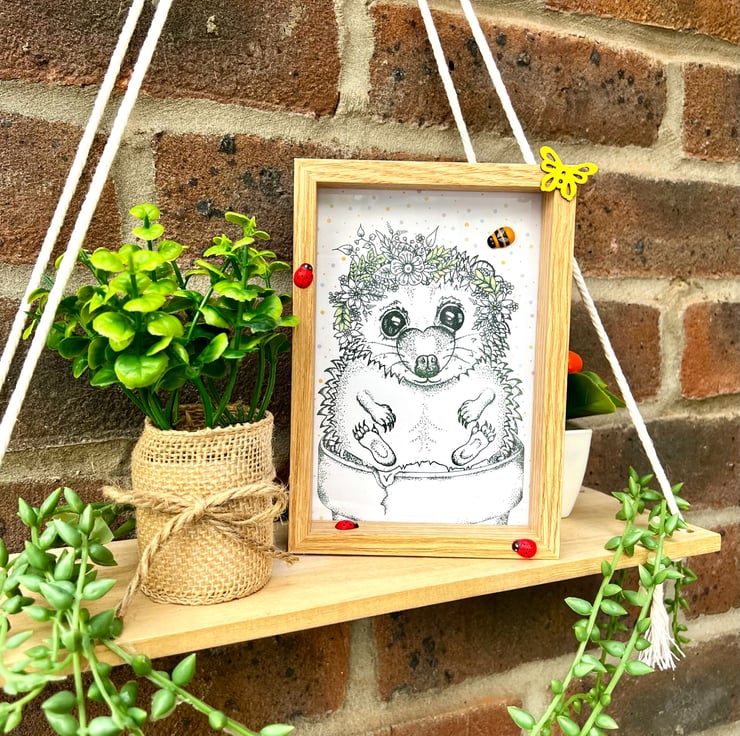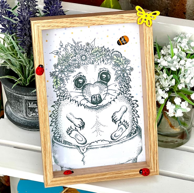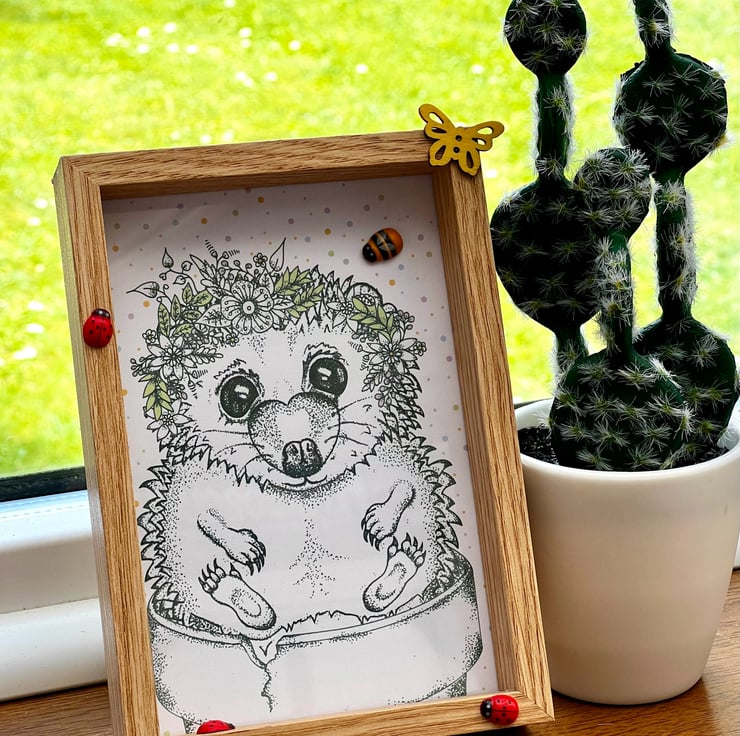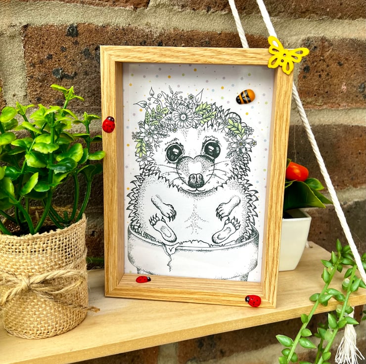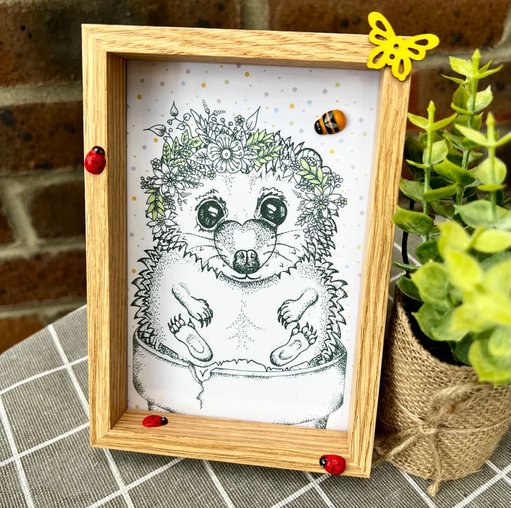 This is a unique and charming decoration and would make a great gift for any hedgehog fan's young or old. The frame comes with a stand and would look great in the kitchen, garden room or child's bedroom/nursery.