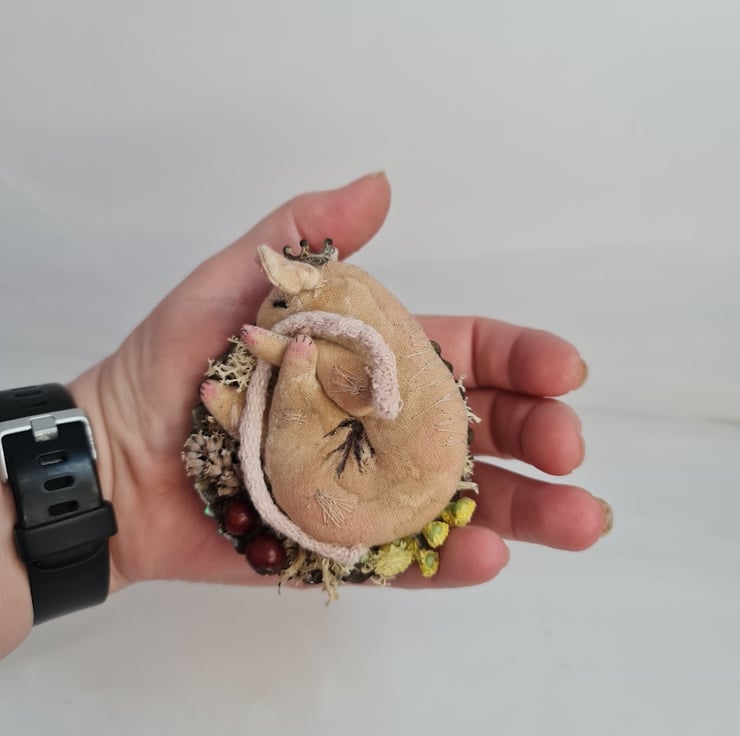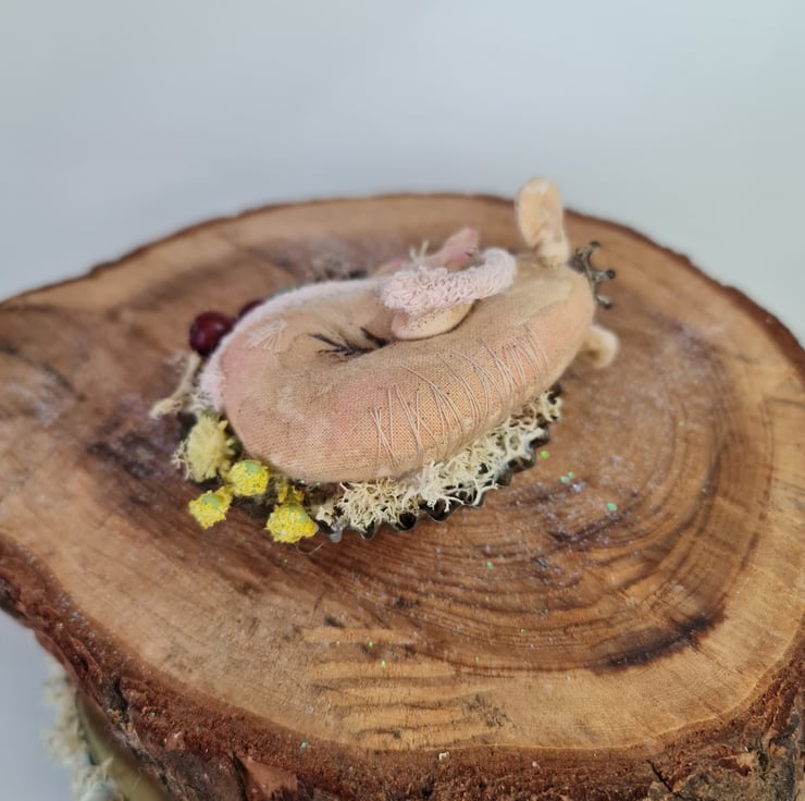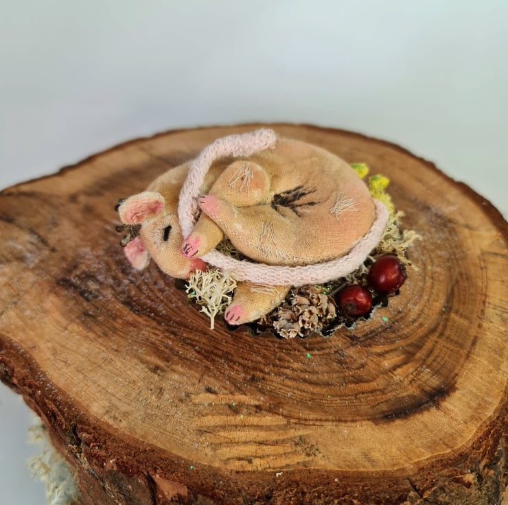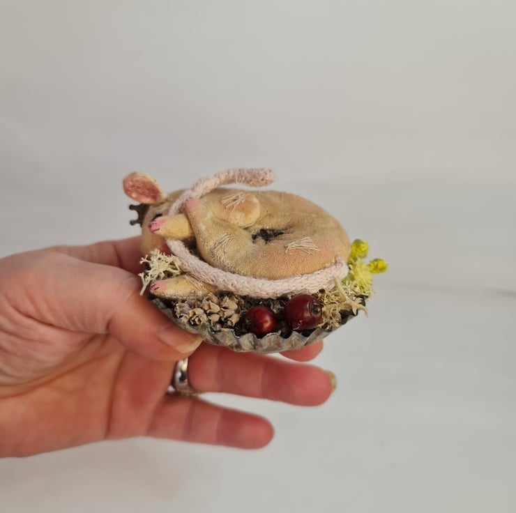 A sweet little mouse hand and machine stiched in unbleached cotton. Stained and hand painted to create an aged vintage feel. Little mouse sleeps in a little vintage tart tin lined with dry moss which, is decorated with berries and flowers.