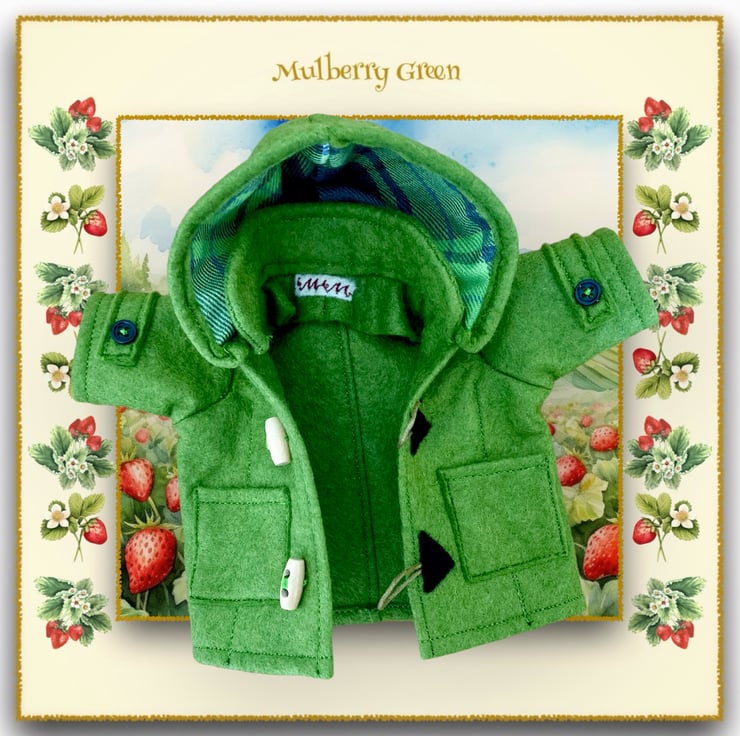 A cute little olive green duffle coat with a tartan lined hood to fit the Mulberry Green dolls. The coat has a hood, two little pockets, sleeve tabs decorated with buttons and leather loop toggle fastenings.