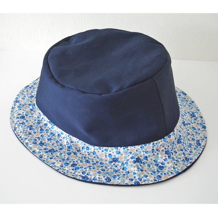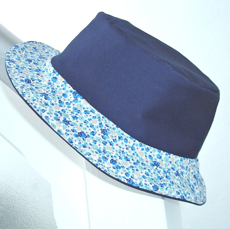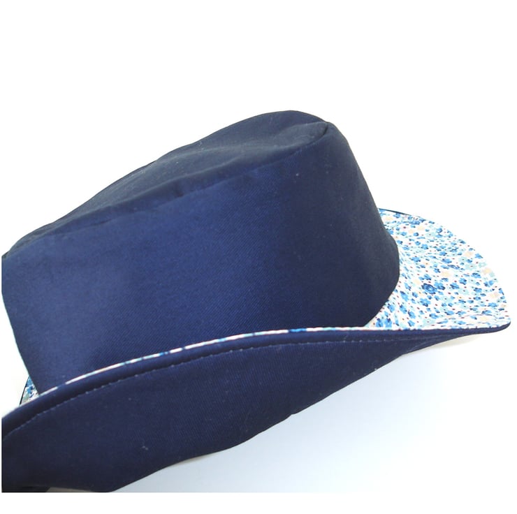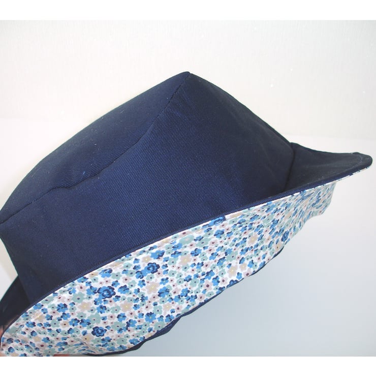 This hat is reversible - floral pattern on the rim only in Blue, Duck Egg, Beige and Navy on one side and plain Navy Blue the other. It can be worn either way out so floral rim on top or underneath.