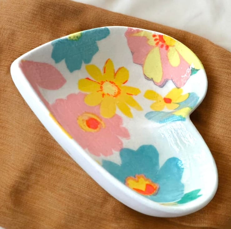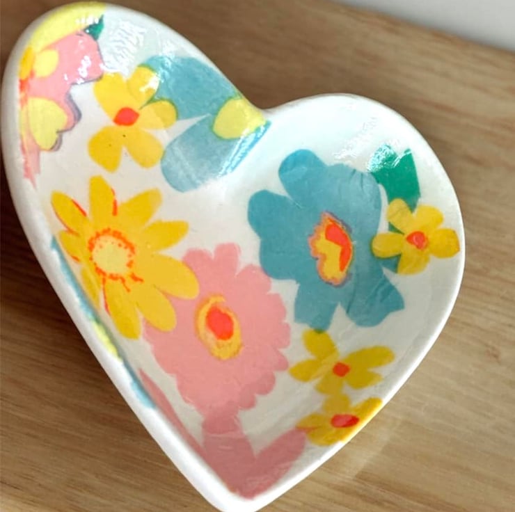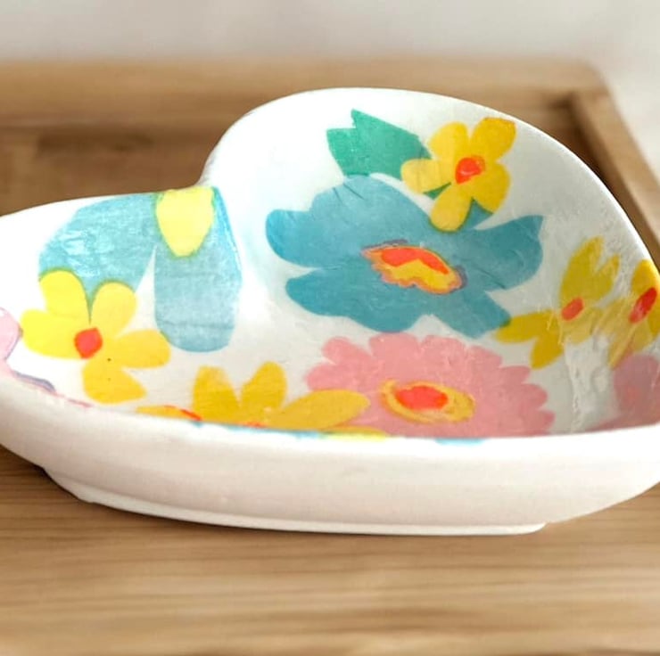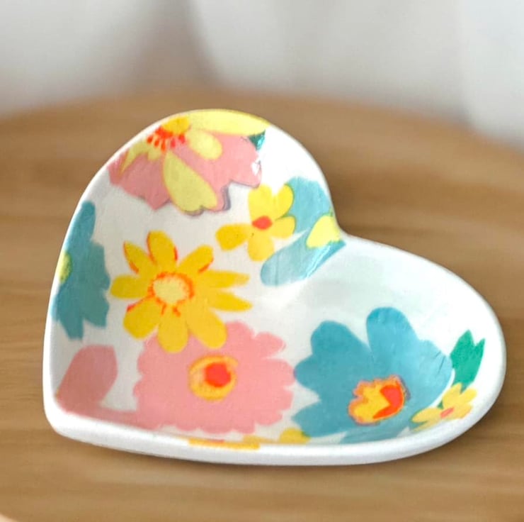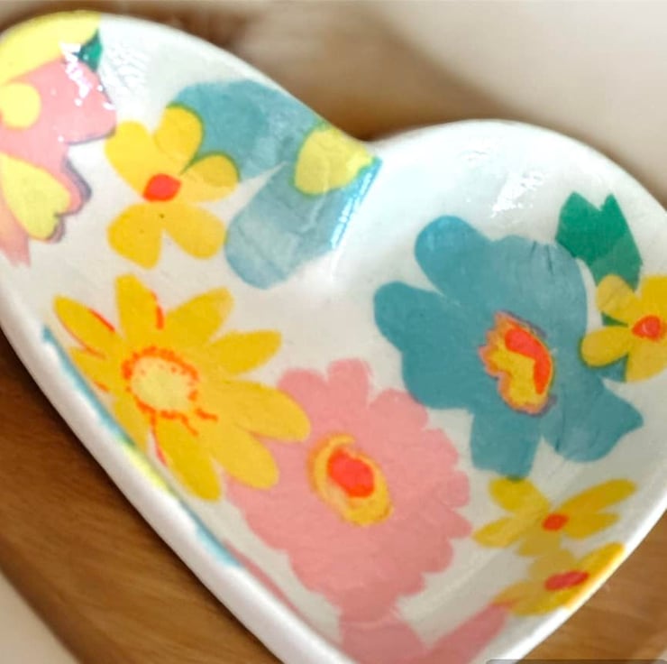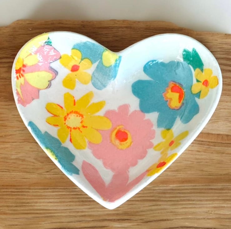 The image has been applied to a handmade plaster of paris ceramic heart shaped shallow dish, using the art of Decoupage and finished with a high gloss glaze, making the colours even more vibrant.
