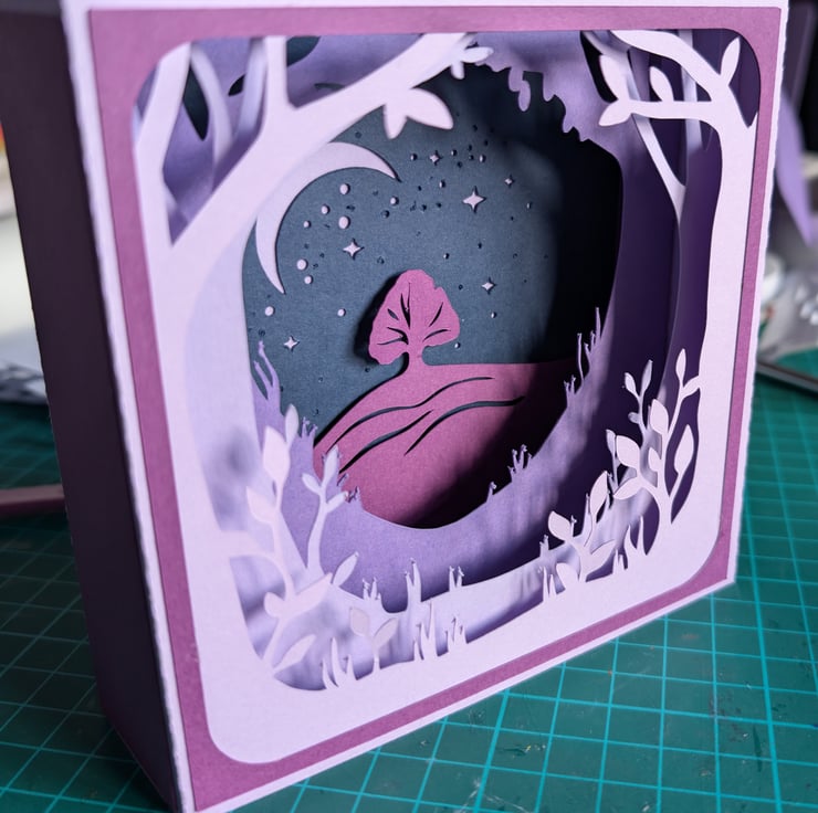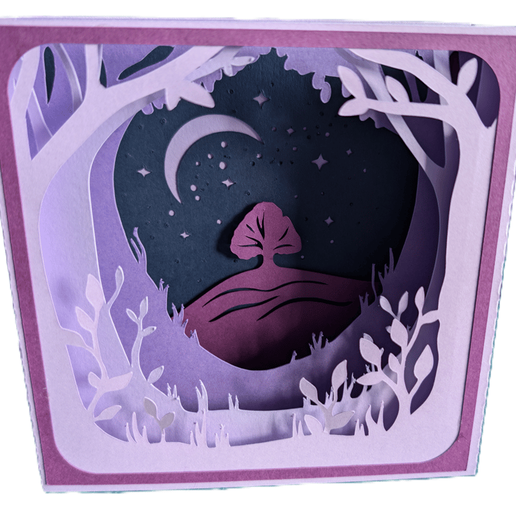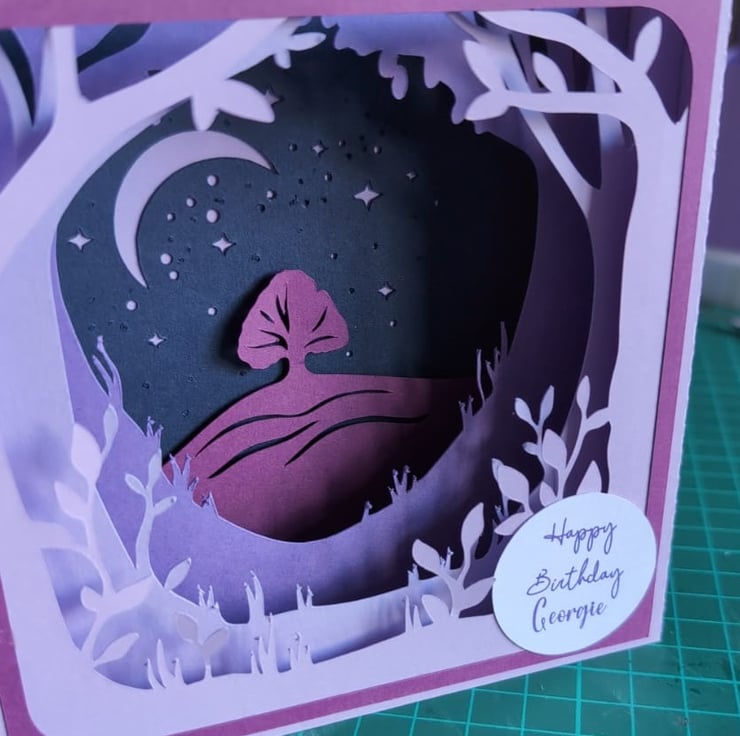 This card has been created in shades of purple card and is 3D showing different layers of the landscape in different shades of purple to pop. The card has a personalised message on the front, and this can be changed to a message of your choice. This card has been created for a birthday, or could be for a new job, new home or just to say hello. Just enter your choice of message in the questions when ordering.