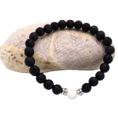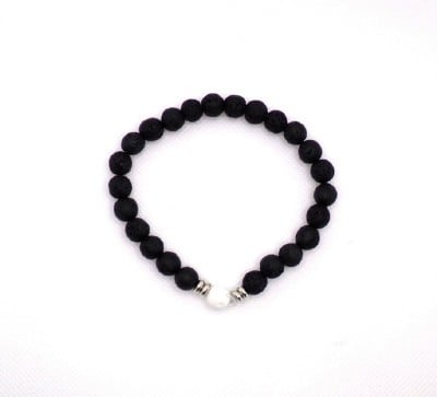 Hand made lava rock bracelet with 8mm black lava rock beads and accented with silver plated spacer beads and a 8 mm centre focal bead of 8mm white lava rock bead,