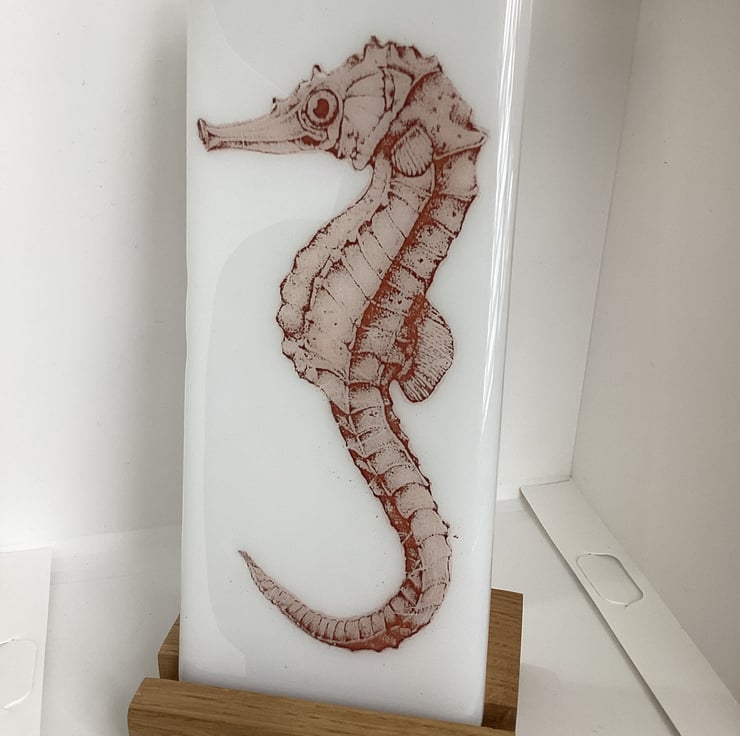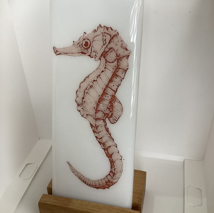 This gorgeous piece of fused glass art has been created with my own unique decal. This neutral toned ornament would grace any home decor and would make a perfect gift for anyone or any occasion, without the stand it measures 8 inches high by 3.5 inches wide not only are seahorses unique this is a one of a kind piece.