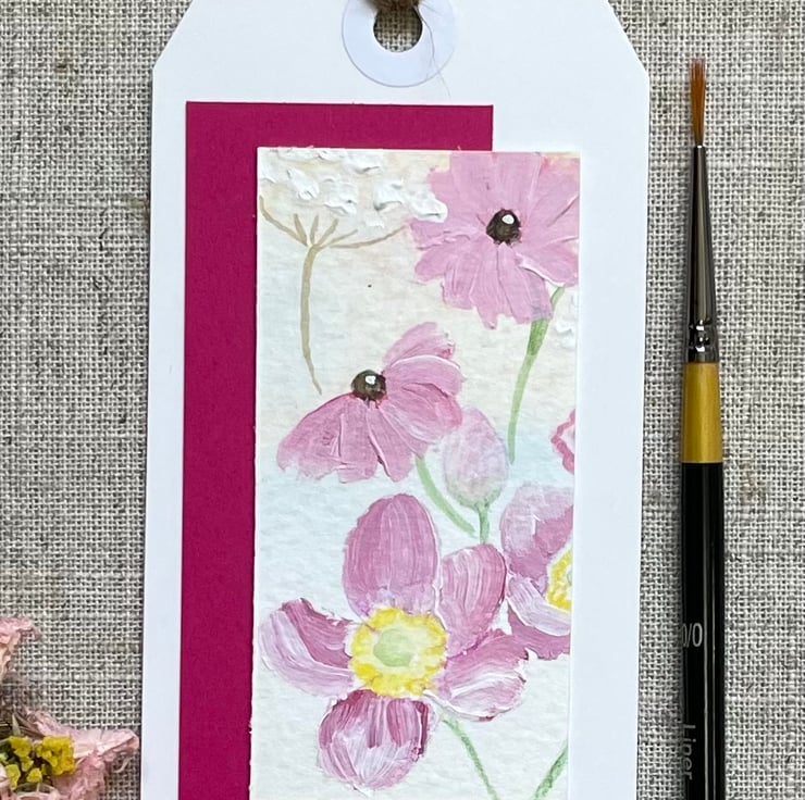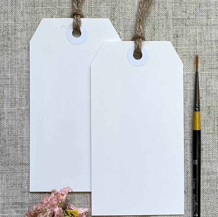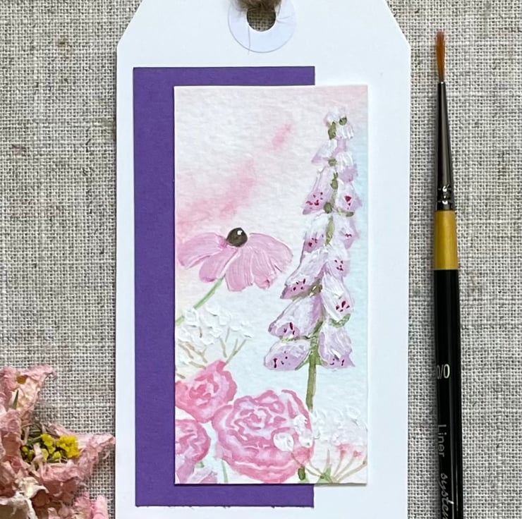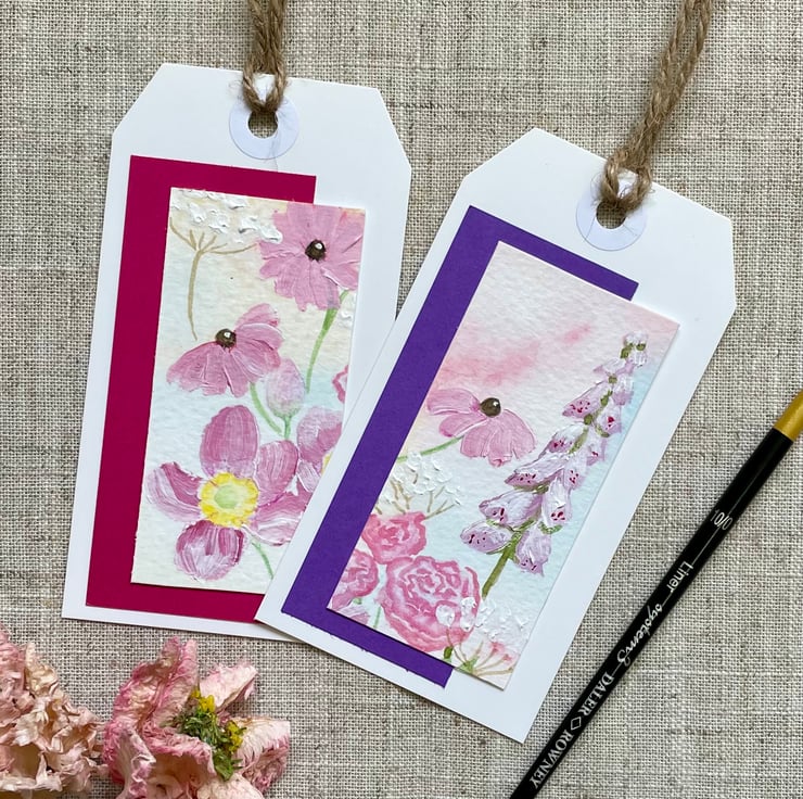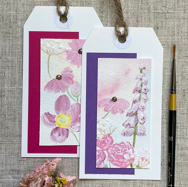 This listing is for a pair of hand painted gift tags, two different designs of summer flowers painted with watercolour and acrylic paint on to 300gsm quality watercolour paper before being mounted onto complimentary pink and purple card and then onto the white tags and completed with jute garden twine.