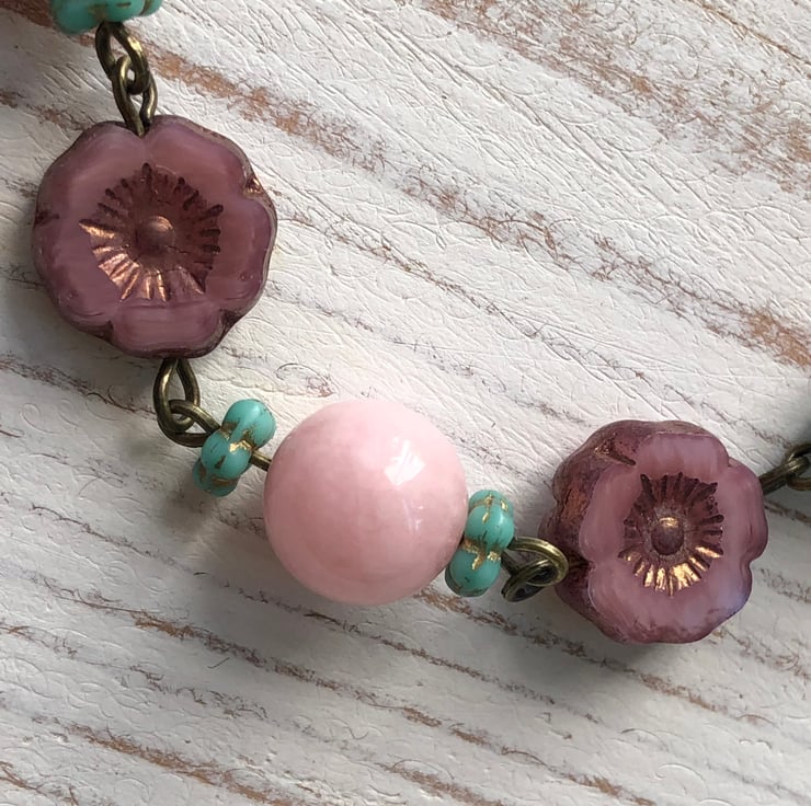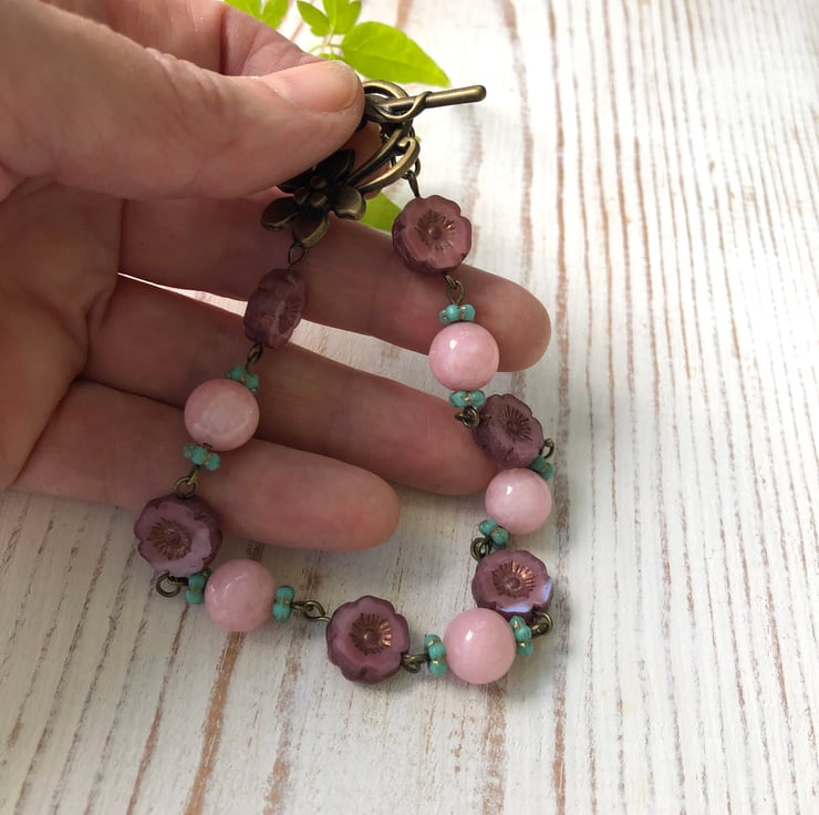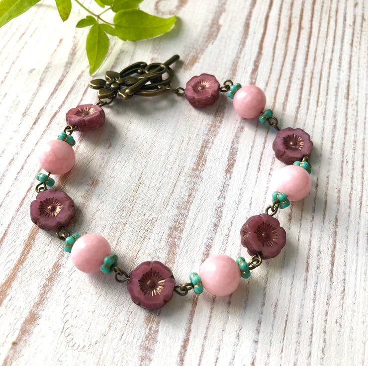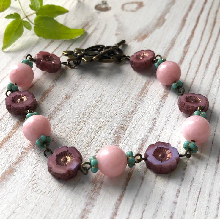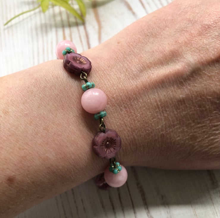 A lovey Bohemian beaded bracelet with AAA quality, 10mm soft pink Morganite gemstone beads, gorgeous 14mm pink / purple Czech glass flower beads & turquoise Czech glass forget-me-not spacers.