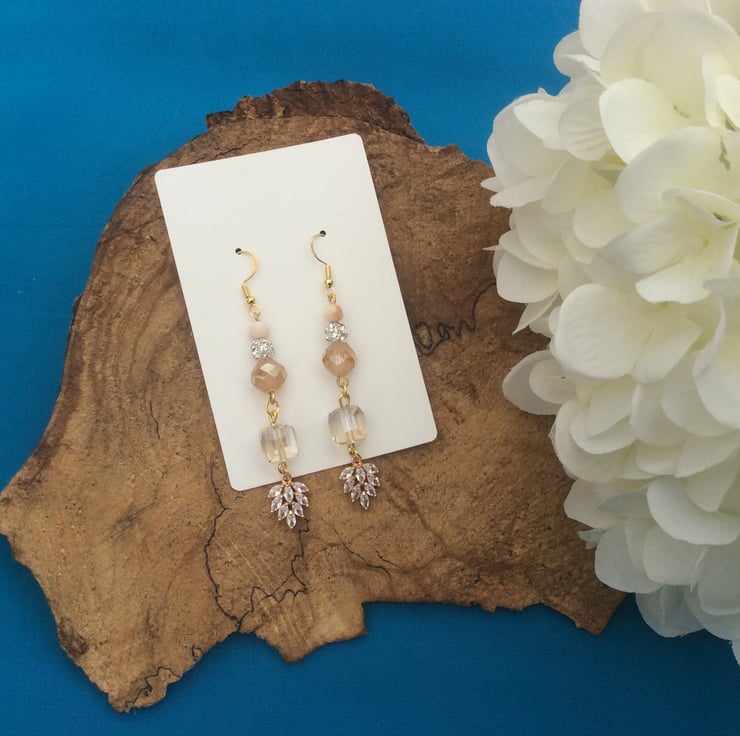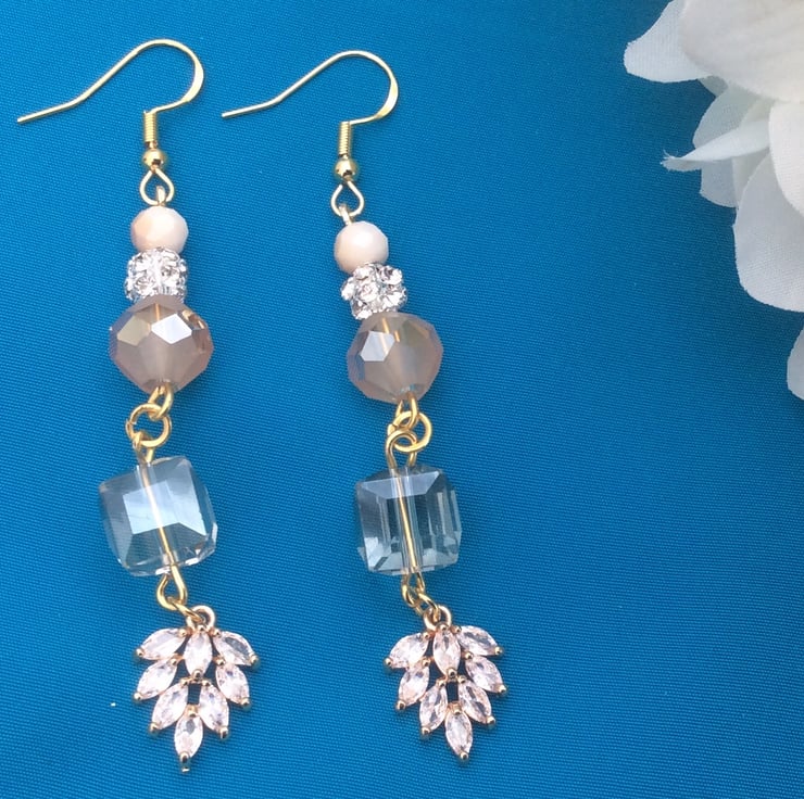 Unique and one of a kind, these earrings ooze style and sophistication. Featuring dazzling silver coloured rhinestone beads, champagne coloured faceted beads and clear glass cubes ending with zircon leaf charms. Gold plated hypoallergenic ear wires have been used for those with sensitive skin. The drop measures roughly 6cm from the bottom of the ear wire. Perfect for that bridal outfit or would add a touch of glamour to any special outfit on any special occasion.