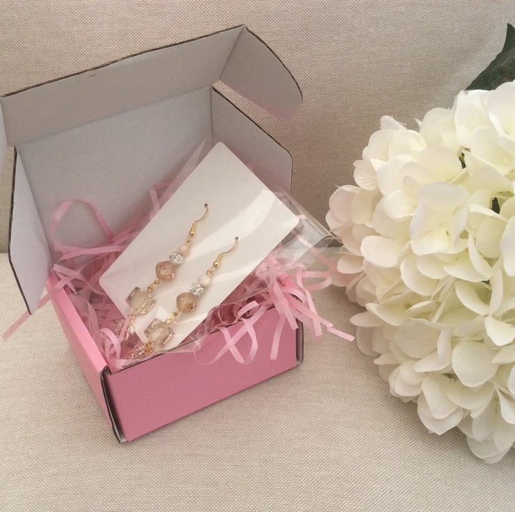 Your earrings will arrive in a pretty pink box packaged with pink shredded tissue paper, all packed up and ready to go if your purchase is a gift for someone.