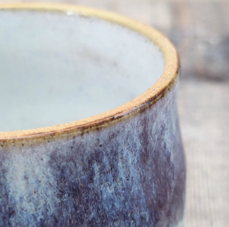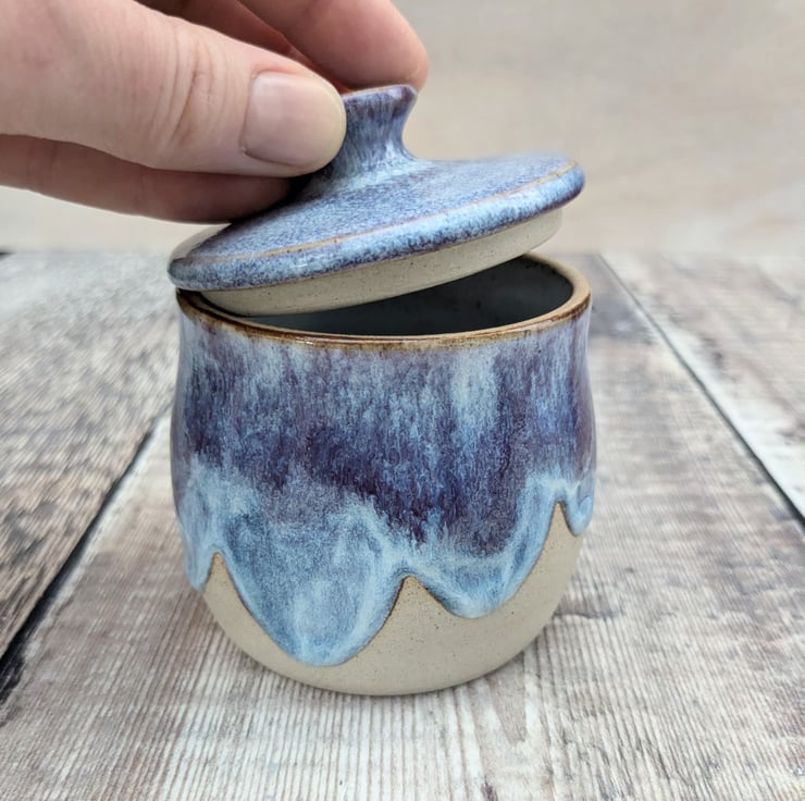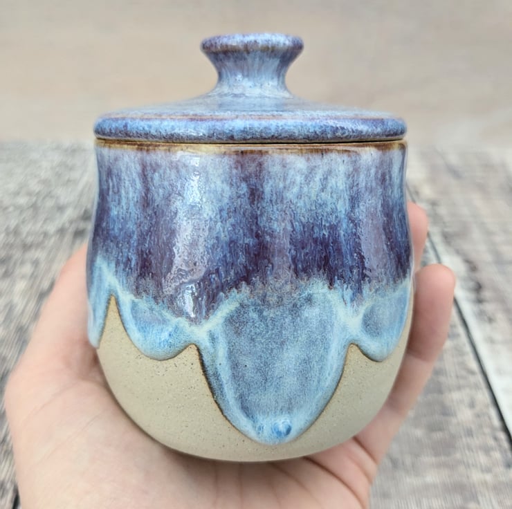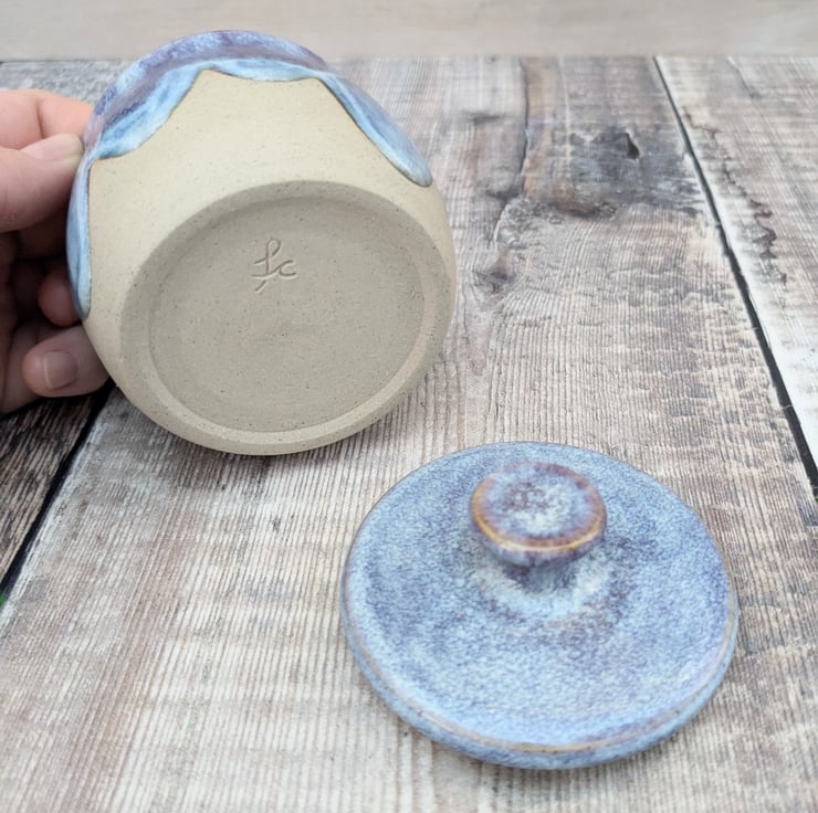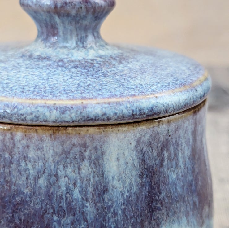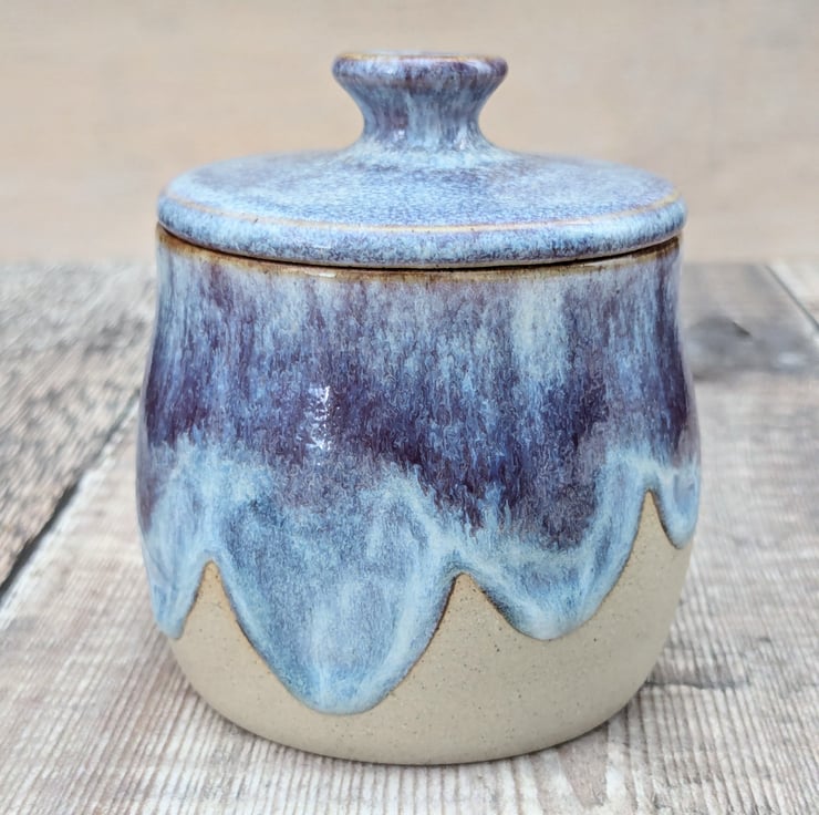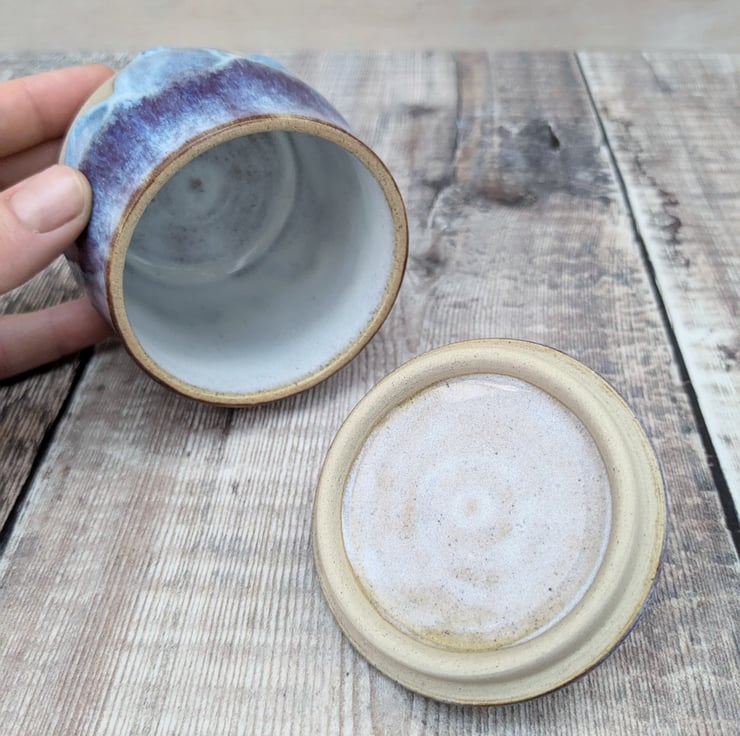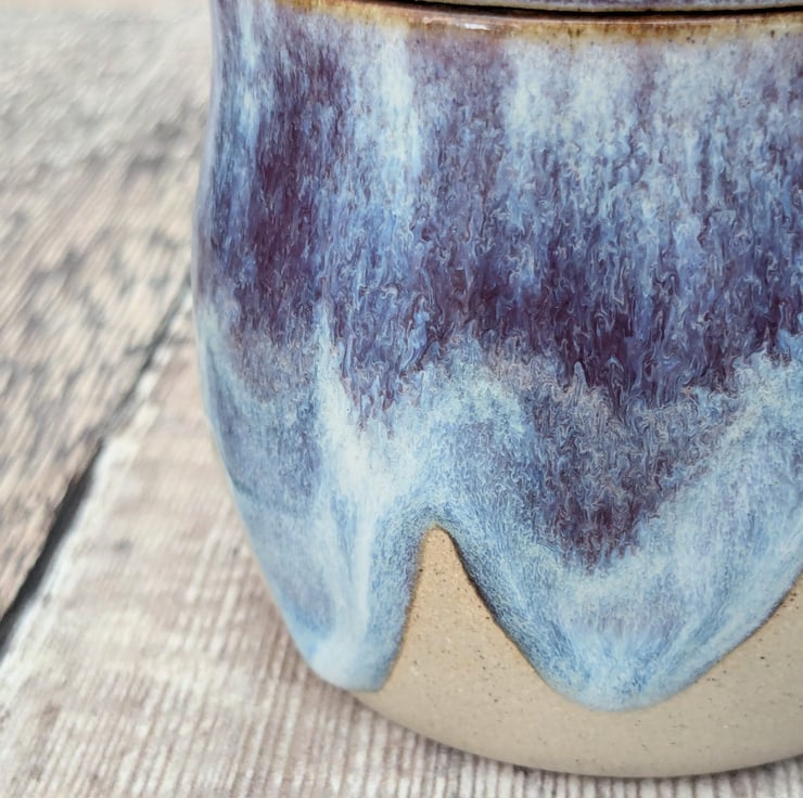 A small lidded pot, wheel thrown in a buff stoneware clay. The inside of the pot is glazed in a white with beautiful variations in the colour. Outside is a light purple blue colour, deepening in colour as it flows down to purple then into blue where it thickens as it pools in a drippy design.