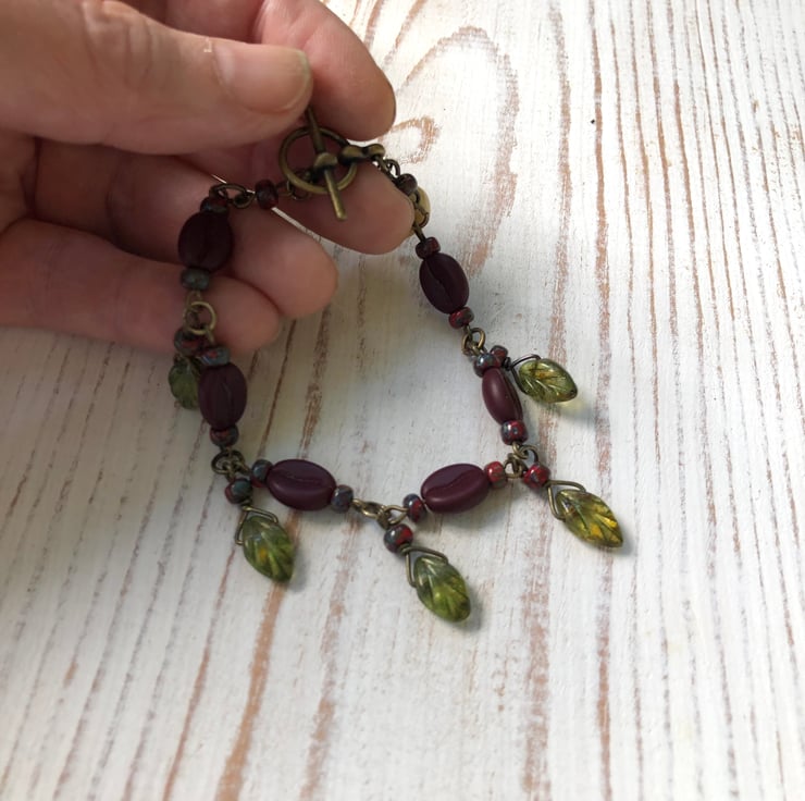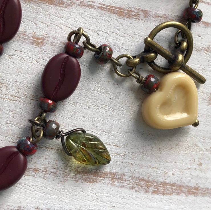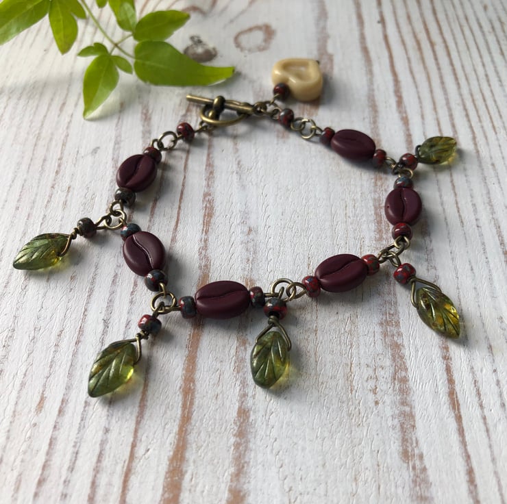 This 'Coffee Lover' bracelet features high quality Czech glass coffee bean beads, Czech glass leaves and red glass seed beads. The beads are formed into a beaded chain bracelet and finished with a bronze toggle clasp and a vanilla heart dangle.