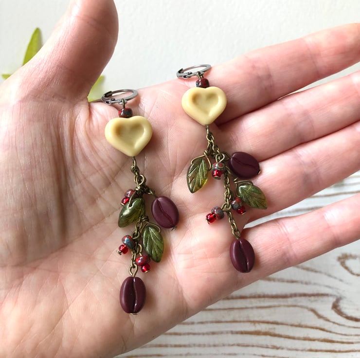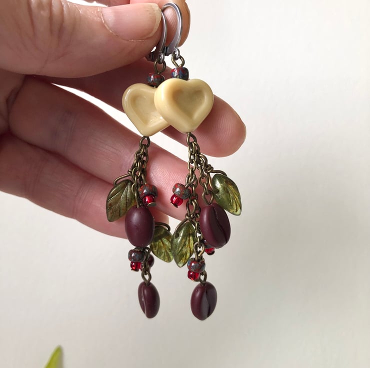 The earrings feature high quality Czech glass coffee bean beads, Czech glass leaves, red glass seed beads and an opaque vanilla heart.