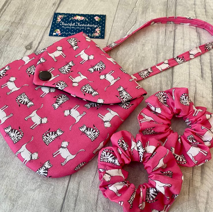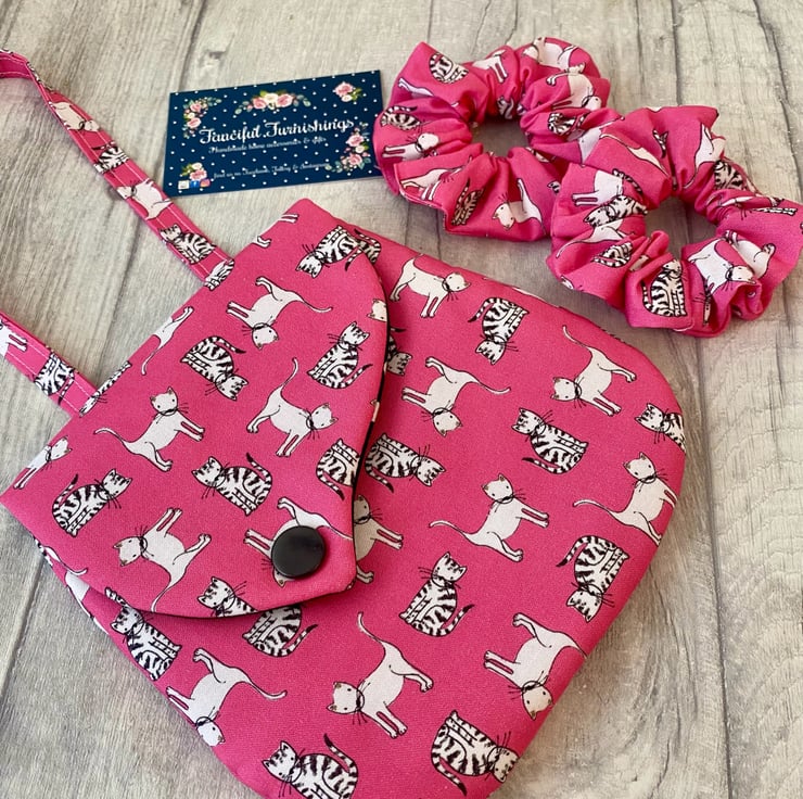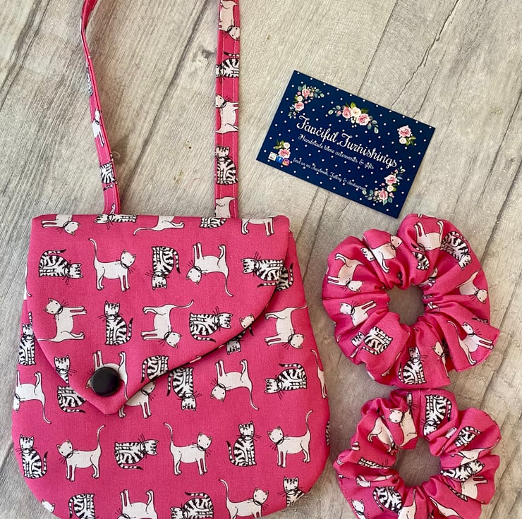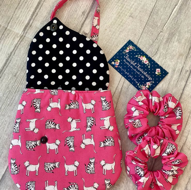 Bag measures approximately 7” x 6.5”, fully lined and has a metal popper fastening. These make fabulous gifts for birthdays or just because! Two scrunchies included making this a perfect little set.