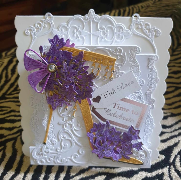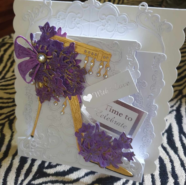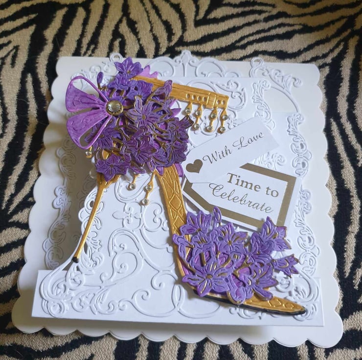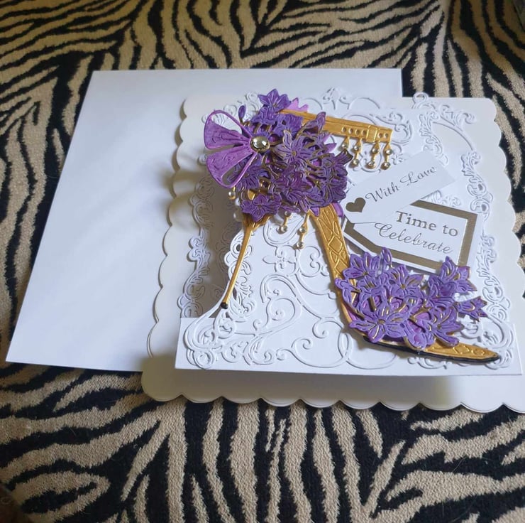 Exquisite Hand Crafted No Verse Cards For All Occasions With Unique Designs Each lovingly Created For that Special Day. This Delightful Gold Decoupage Stiletto With Purple African Lillie's Look So Realistic You Could Almost Forget It Is Just Card, The Card Style Is a 3D Effect To Give Depth And Perspective Of Realism. Each Card Is Crafted With Intricate Detail For A Delight To Treasure And Will Be Shown With A decorated Box or Envelope Where Applicable Also Prices Reflect The Hours Of Crafting This Unique Card And Materials Used.