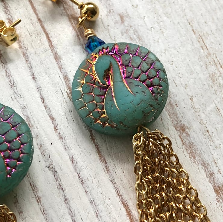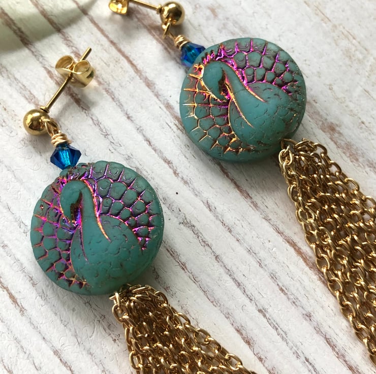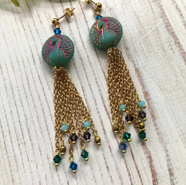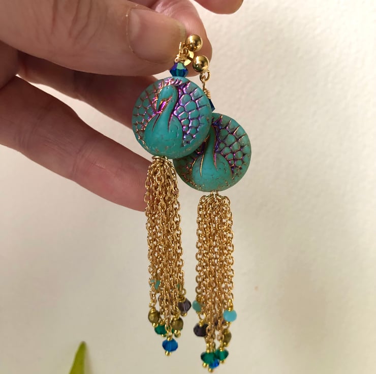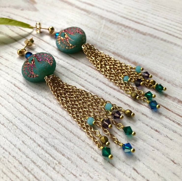 Channel your inner peacock with these unique, one-of-a-kind, dramatic long chain tassel dangle earrings. As soon as I saw the Turquoise Czech Glass Peacock beads I knew I had to have them. I have added tarnish resistant gold-plated beaded chain tassels with sparkly glass beads to mimic the Peacock's tail and finished them with gold-plated stainless steel studs.