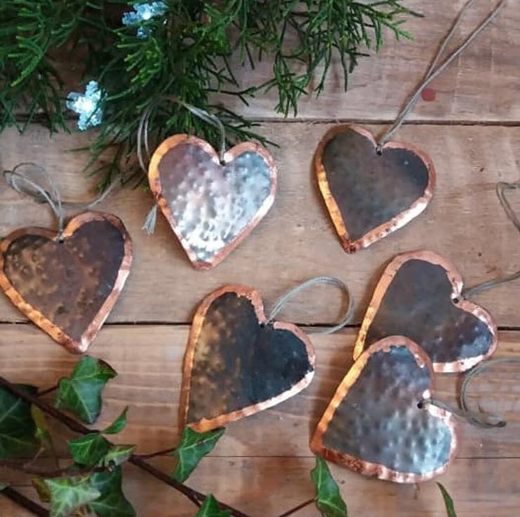 Set of 6 metal hearts, made from Reclaimed Tin harvested from Coffee Cans from our local deli. This pretty little set of hearts come decorated with gold Leaf and look so nice on a garland or tree or hung around your home at any time of the year, and also make a great wedding decoration or 10th Wedding anniversary gift. They come in a Gun Metal Grey finish or Silver ( the silver still has the print from the cans on the back of them ) They can be bought out every year thus giving you a green Christmas as well as a Merry one. Each heart is approx 2.5" in size .