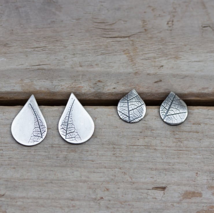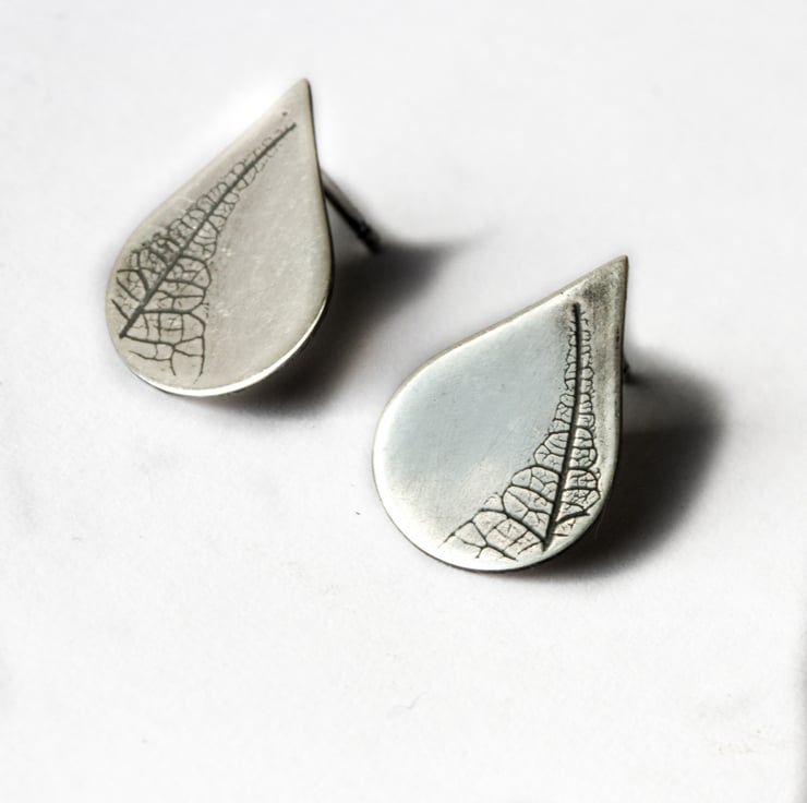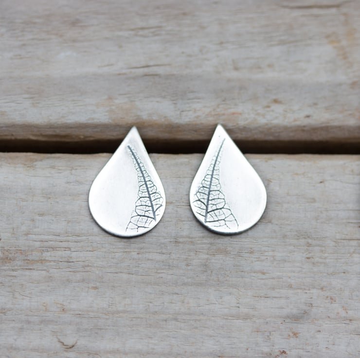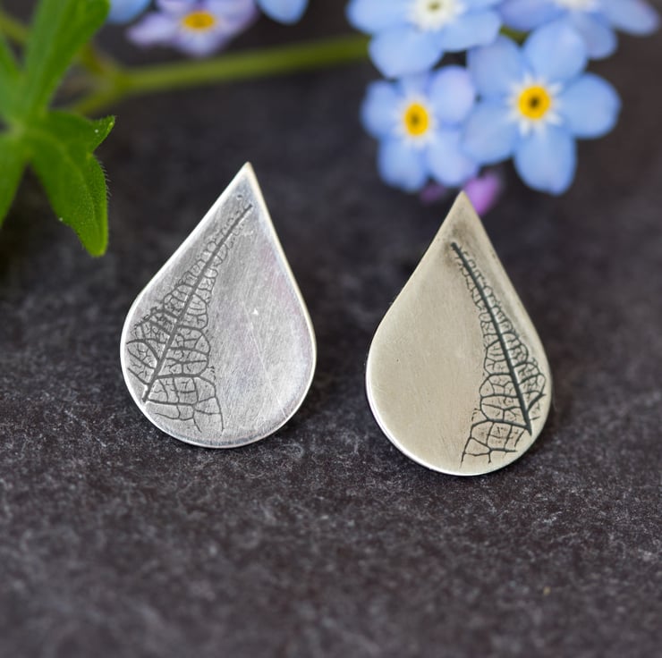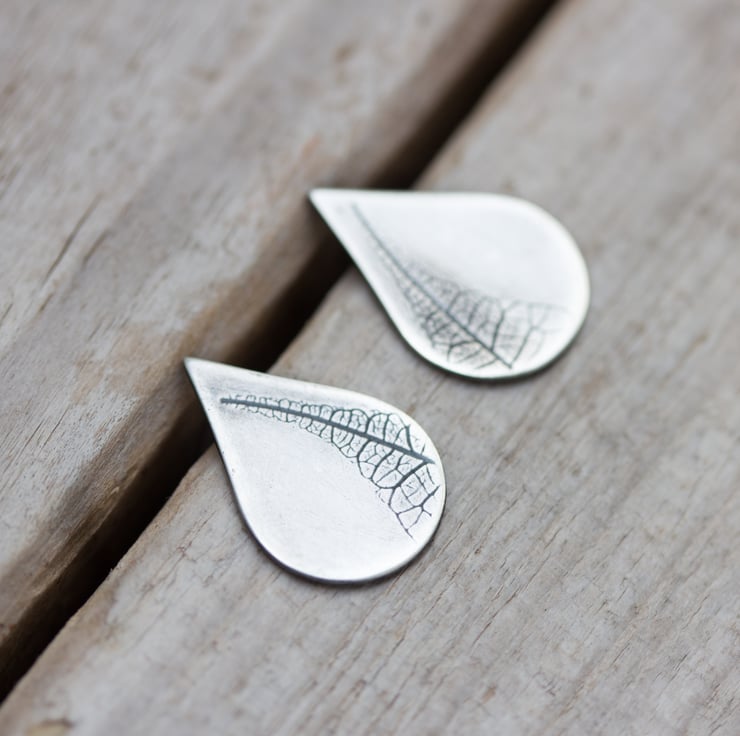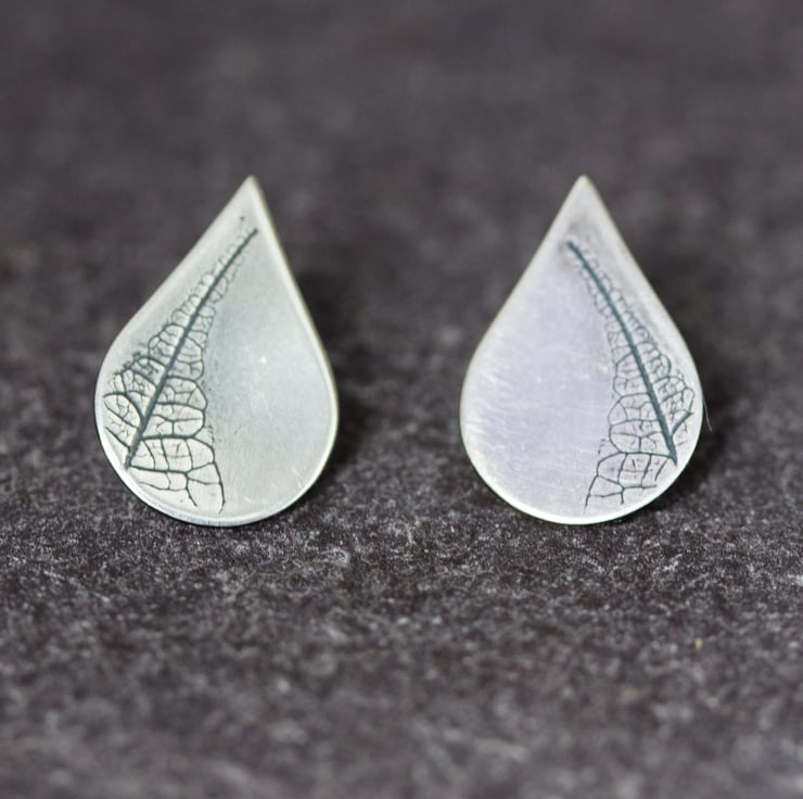 Tear drop or rain drop shaped recycled sterling silver ear studs imprinted with the tip of a skeleton leaf. Oxidised and polished to accentuate the leaf imprint and create a gentle sheen these ear studs are perfect for nature lovers.