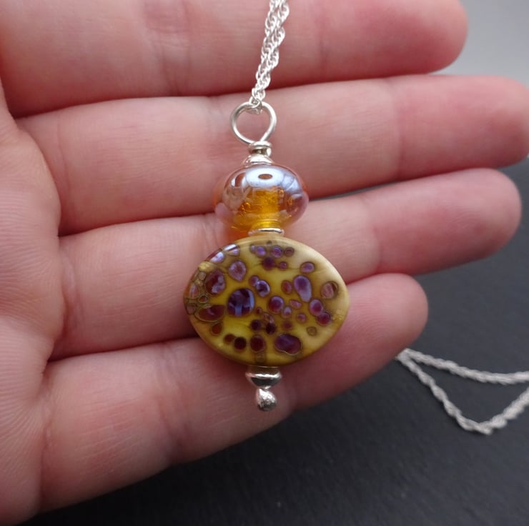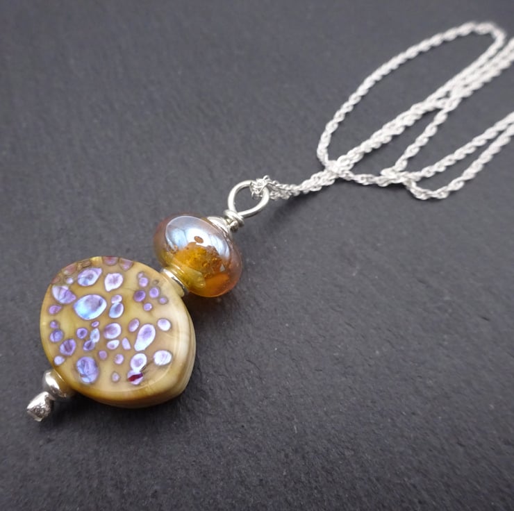 The pendant has been made using a gold handmade lampwork glass beads and a ivory and silver speckled lampwork glass bead.