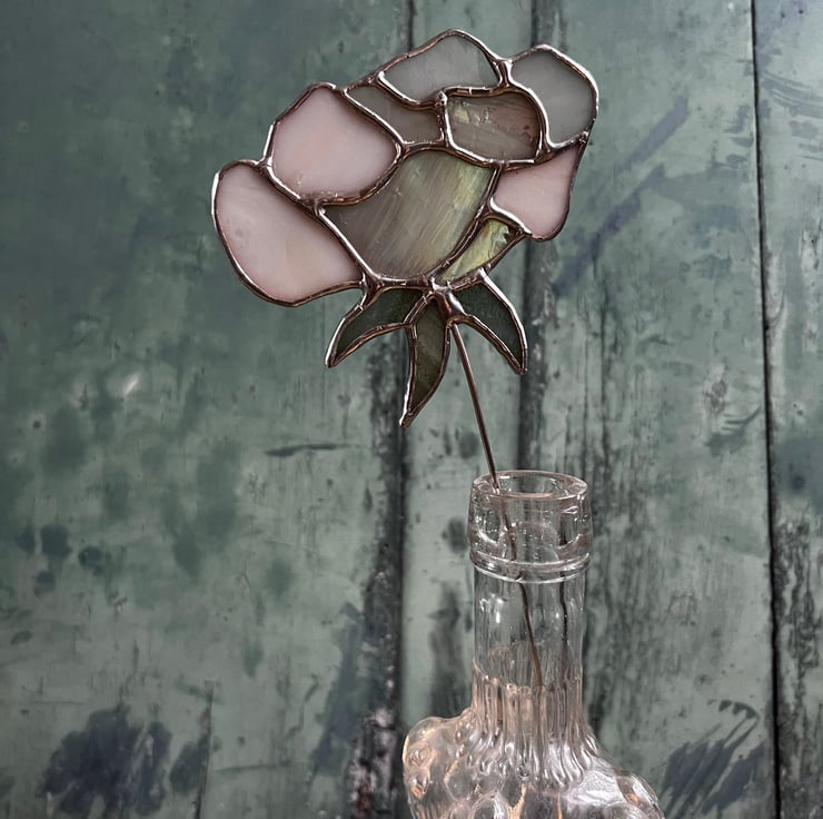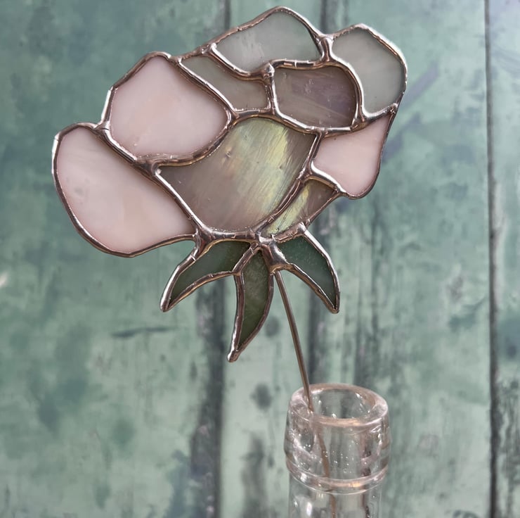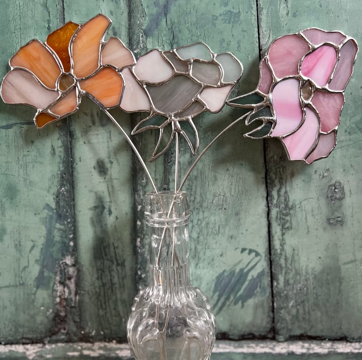 Approximately 32cm long, the stained glass flower itself is around 9cm tall and has a solder bobble on the end of the stem.