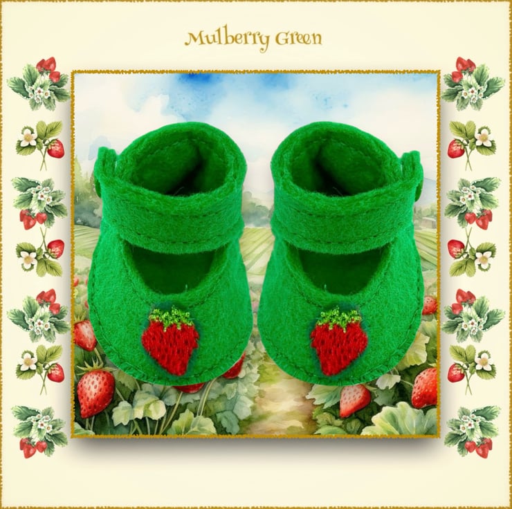 A cute little pair of emerald green shoes, embroidered with little strawberries, to fit the Mulberry Green characters. The shoes look lovely with the little dresses.