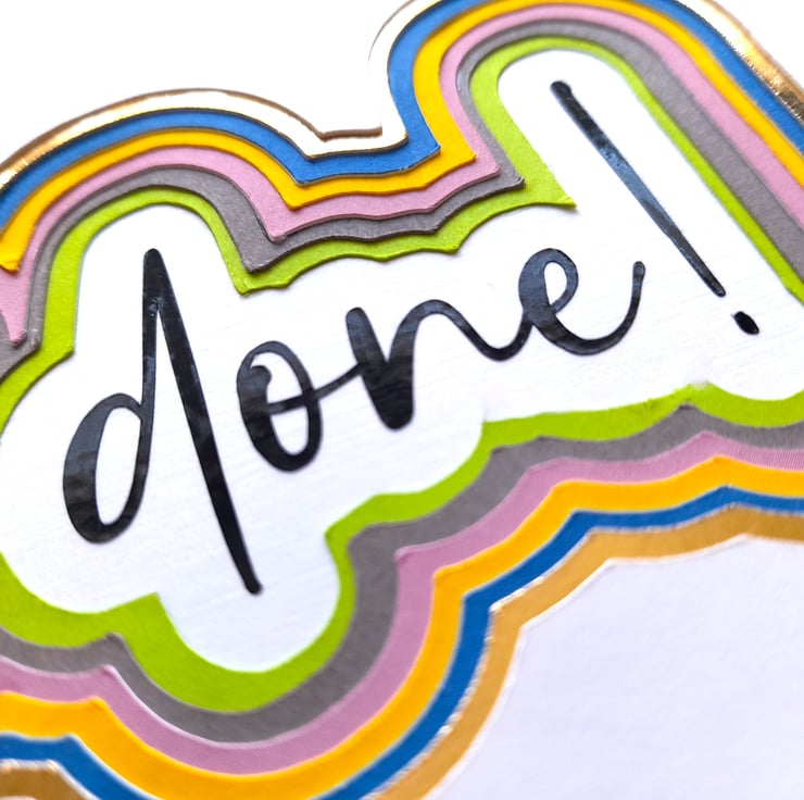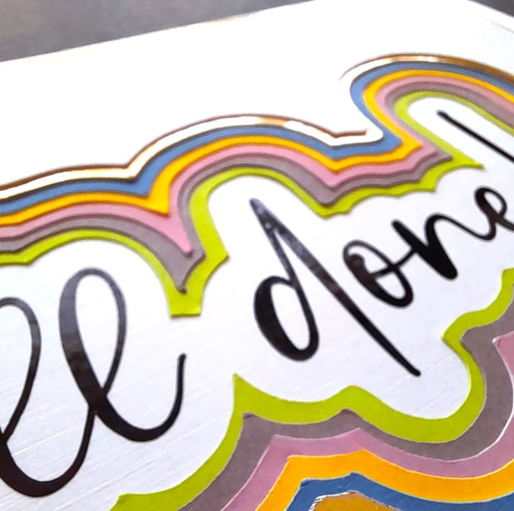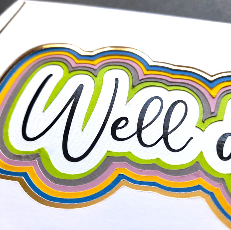 One colourful well done achievement greetings card, which is handmade from seven layers of different coloured card (not including the card backing), and self-adhesive vinyl lettering.