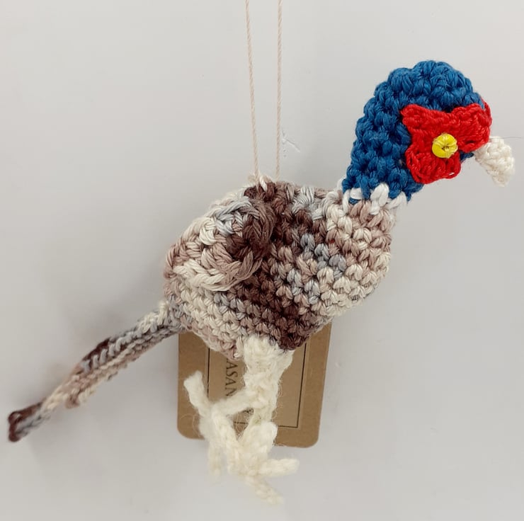 This colourful chap is all set to deliver a message on your behalf. He is crocheted in cotton and filled with polyester stuffing. There is a wooden coffees stirrer inside the tail to keep it rigid and a tiny yellow glass bead for an eye. The pheasant measures approximately 17 cm at its widest point and is approximately 9cm tall. He comes in shredded tissue paper 'grass ' in a labelled PIP ( Postage in Proportion) box all ready to be given or posted on. A tag is included in the box and it reads, ' I got you a birthday pheasant!' Please note that I am very happy to exchange this tag for one with wording of your choice to suit any occasion.