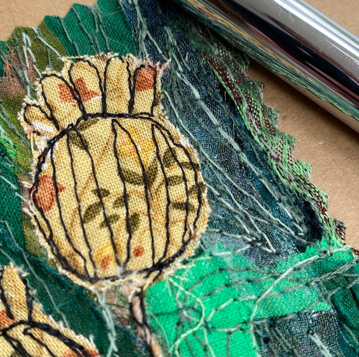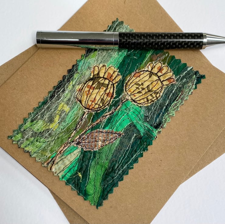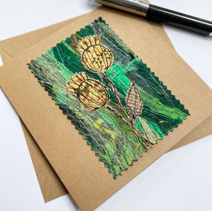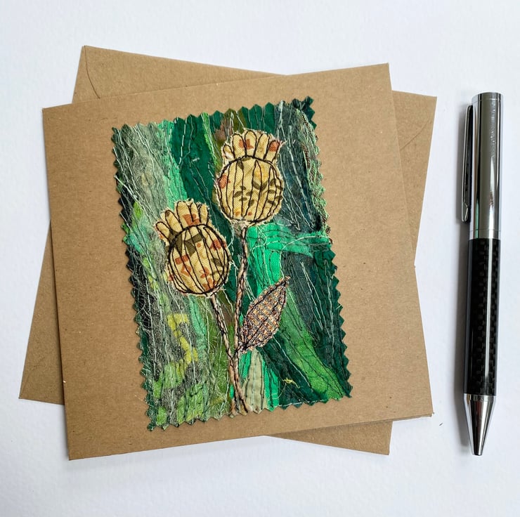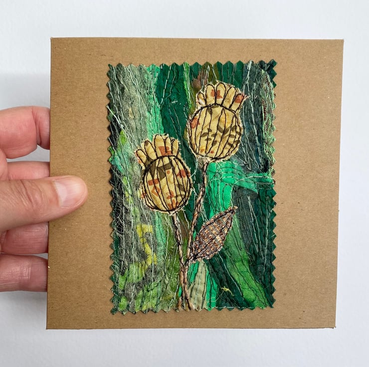 This endearing embroidered dried poppy seed head garden card has been made with up-cycled fabrics and enhanced with free motion embroidery. It’s perfect for special people and occasions. It is blank inside. This brown card measures 13.5 x 13.5cm, comes with an envelop and in a plastic cover for protection.