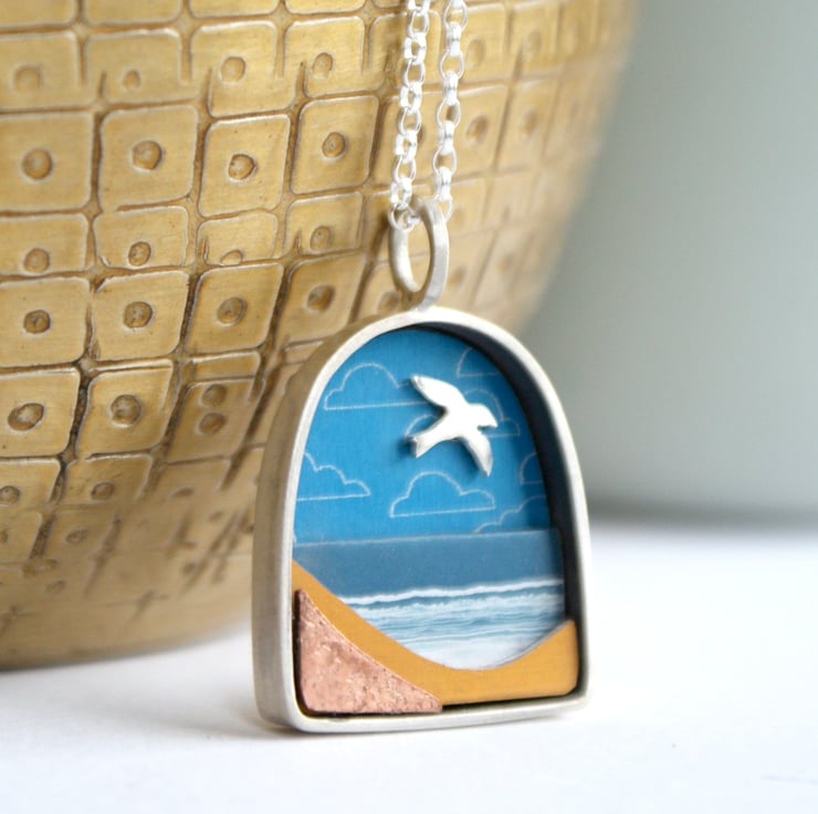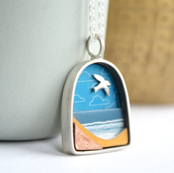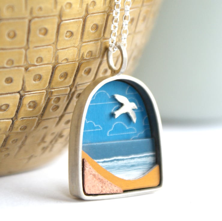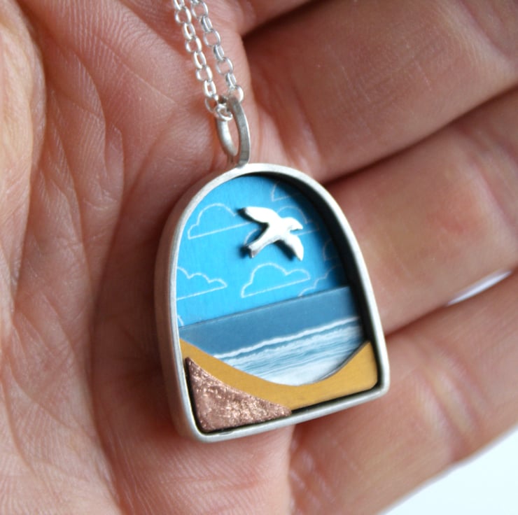 Bring a little bit of joy to your day with this little sea side necklace. It would make a perfect gift for that special someone. The little seascape has been constructed in layers of coloured aluminium and copper which gives a lovely 3D effect. It is set within a sterling silver frame with deep sides, known as a shadow box and has a tiny silver seagull flying in the sky. The inside edge has been oxidised to a dark grey which really makes the colours pop. The silver has been polished to a satin finish.
