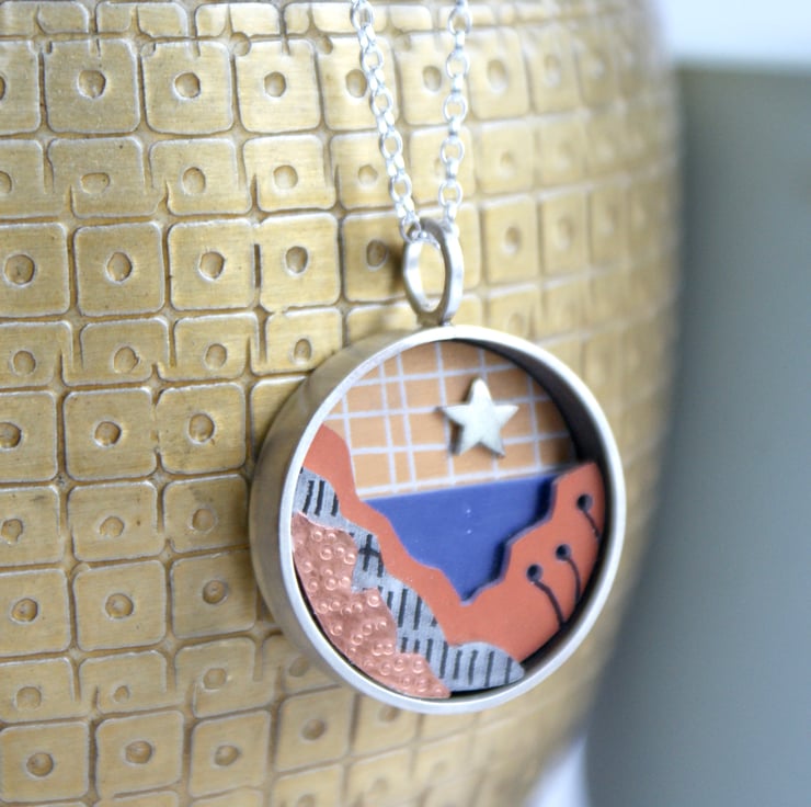 A lovely shadow box necklace featuring a little seascape in sunset colours. It would make a perfect gift for that special someone. These view has been constructed in layers of coloured aluminium and copper which gives a lovely 3D effect. It is set within a sterling silver frame with deep sides, known as a shadow box and has a tiny silver star in the sky. The inside edge has been oxidised to a dark grey which really makes the colours pop. The silver has been polished to a satin finish and the words 'Wish upon a star' are engraved on the reverse.