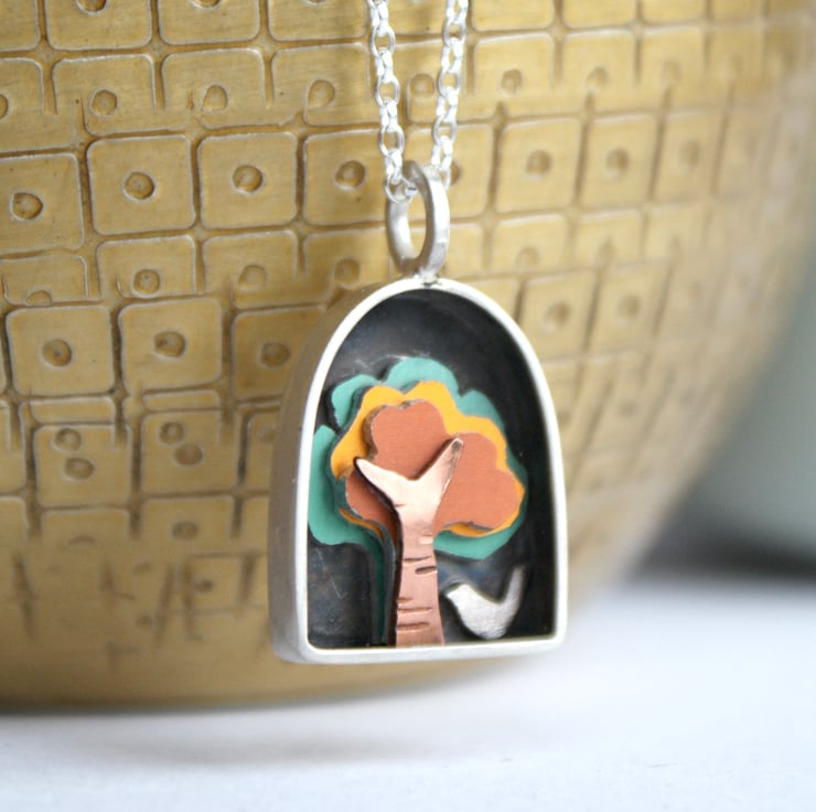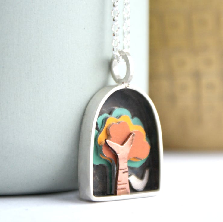 Bring a little bit of joy to your day with this tiny tree necklace. It would make a perfect gift for that special someone. The tiny coloured tree has been constructed in layers of coloured aluminium and copper which gives a lovely 3D effect. It is set within a sterling silver frame with deep sides, known as a shadow box and has a tiny silver bird sitting beneath it. The inside has been oxidised to ab dark grey which really makes the colours pop. The silver has been polished to a satin finish and there is a tiny heart engraved on the reverse.
