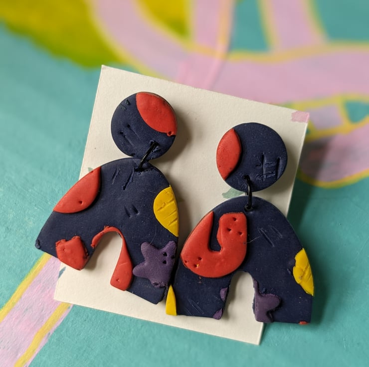 These handcrafted, statement-making earrings in vibrant primary colour, feature a navy blue 'arch' shape, and smaller disc above, made from polymer clay (Fimo). The bold, oversized design is adorned with red, yellow and purple textured shapes. ensuring that these earrings will stand out and make a lasting impression.