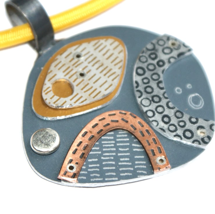 A one of kind necklace hand crafted from layers of anodised aluminium with silver and copper details. The coloured parts feature my own patterns and the pieces have been immersion dyed then cut and finished before being layers together and joined with silver rivets.