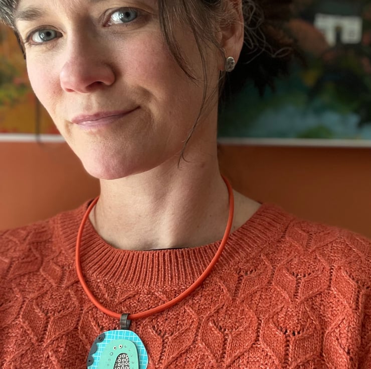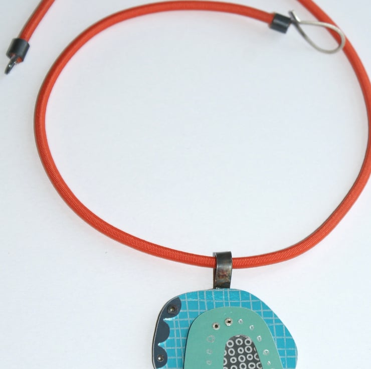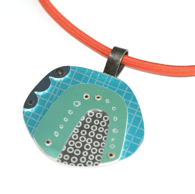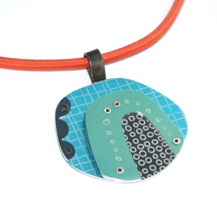 A one of kind necklace hand crafted from layers of anodised aluminium with black detail. The coloured parts feature my own patterns and the pieces have been immersion dyed then cut and finished before being layers together and joined with silver rivets.