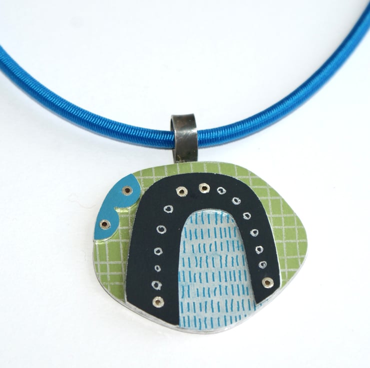 A one of kind necklace hand crafted from layers of anodised aluminium with black detail. The coloured parts feature my own patterns and the pieces have been immersion dyed then cut and finished before being layers together and joined with silver rivets.