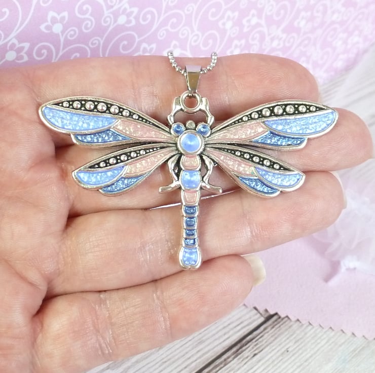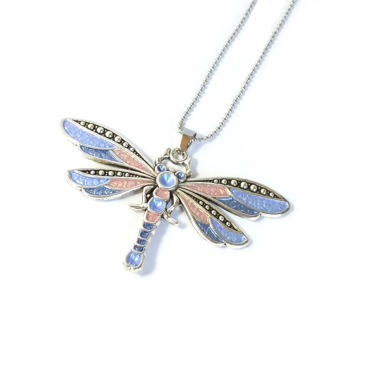 Blue dragonfly pendant, dragonfly necklace in shades of blue and pink