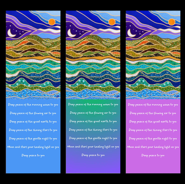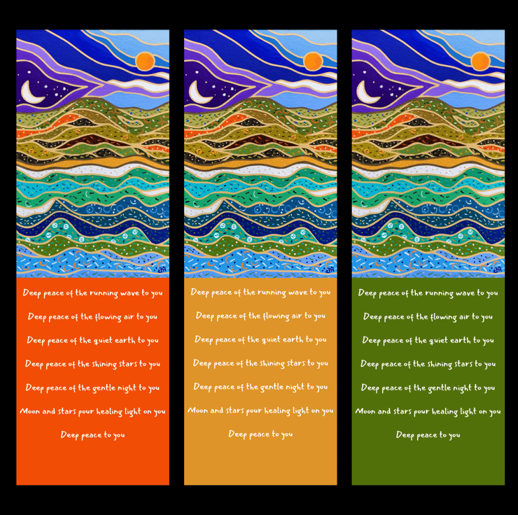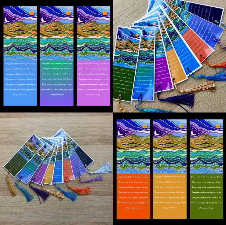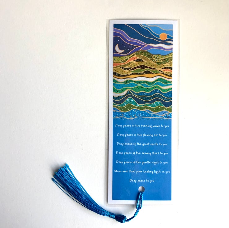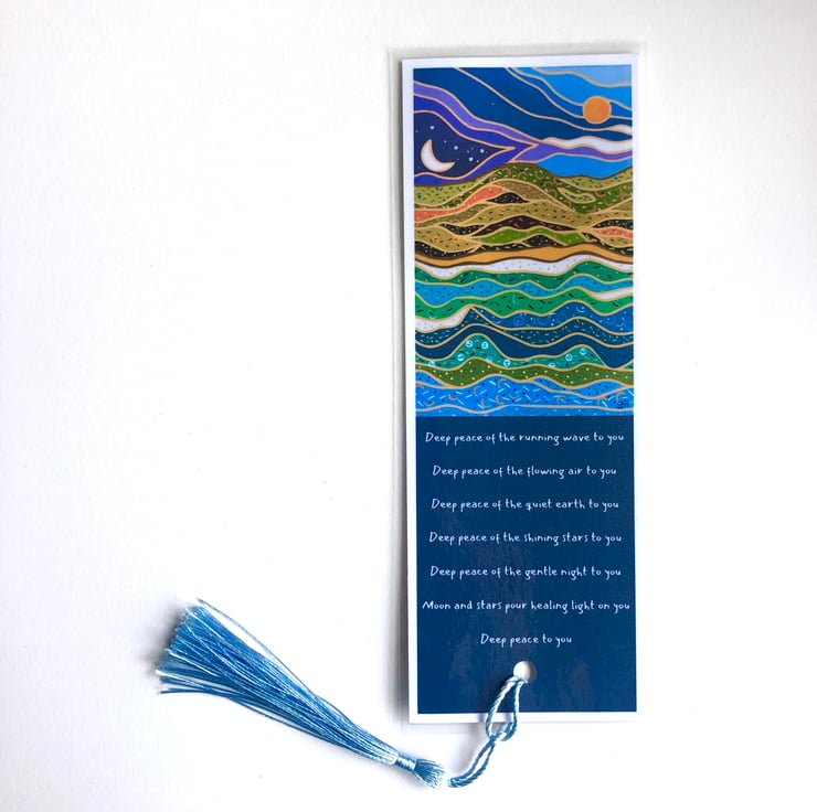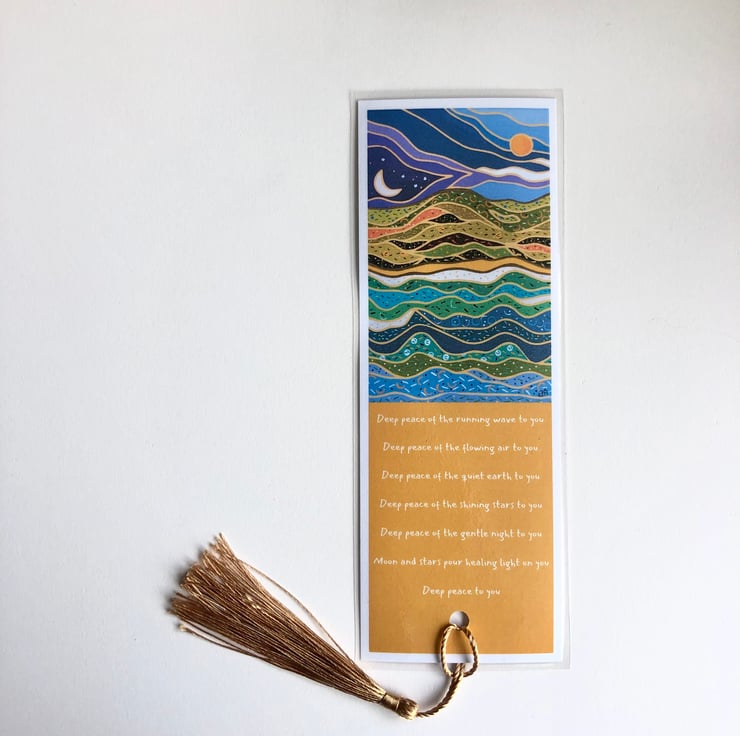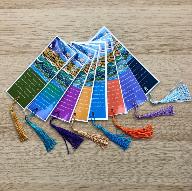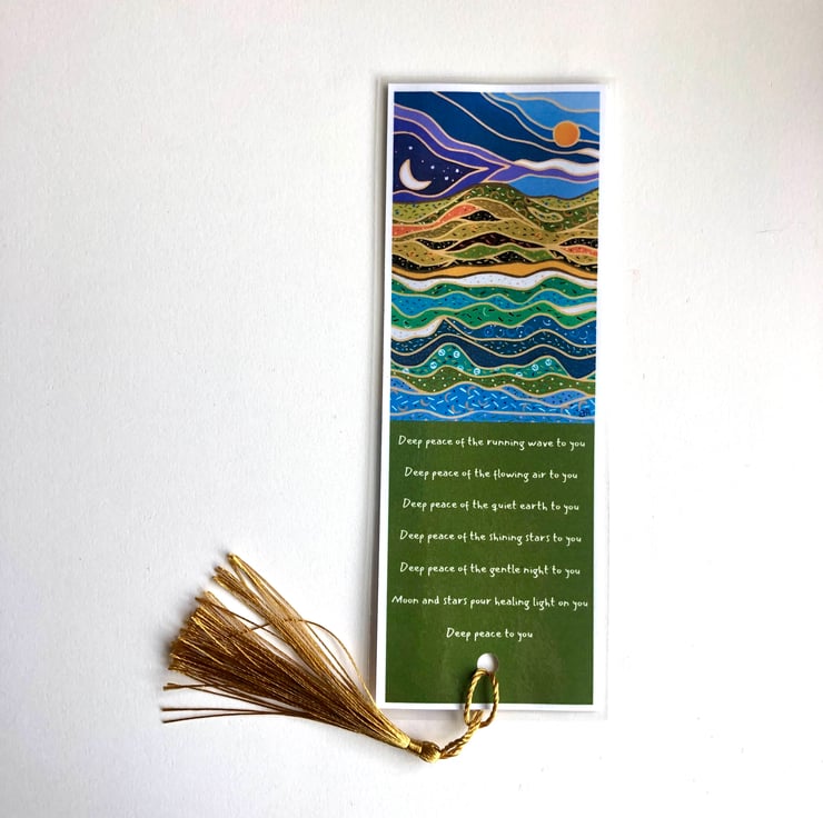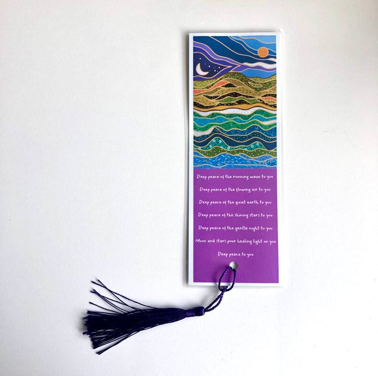 The laminated 15x5cm bookmarks feature part of the Deep Peace Blessing below an extract from an acrylic painting that I made. Each bookmark is finished off with a silky tassel (please note tassel colours may vary from those illustrated but will always tone with the bookmark).