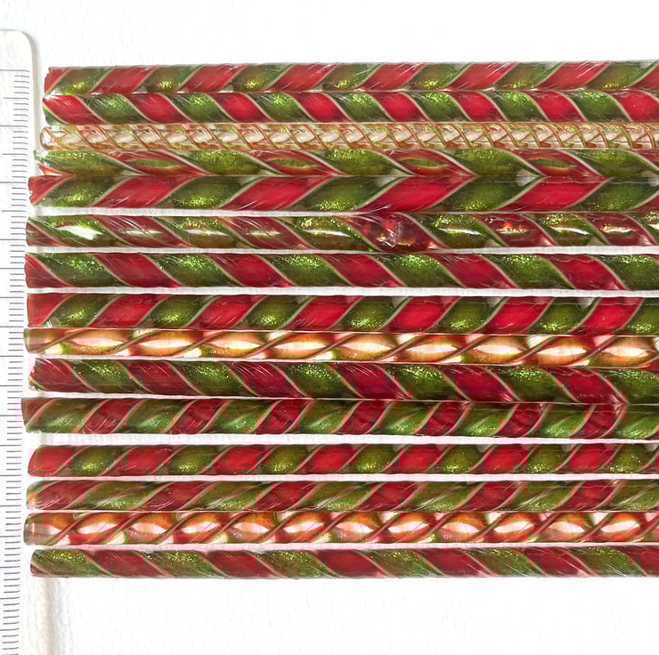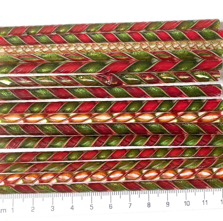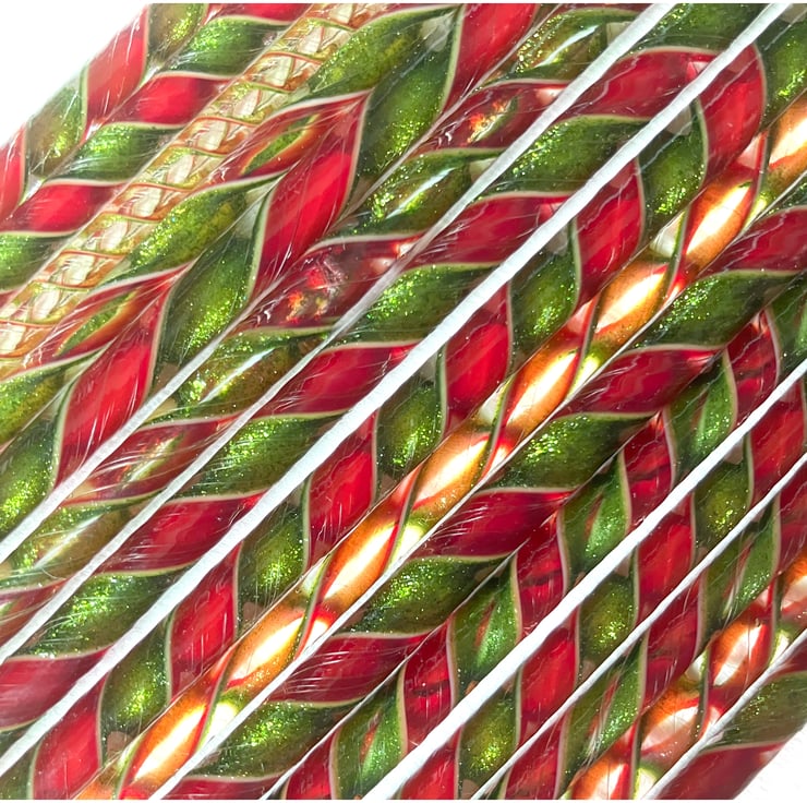 Christmas pack of twisty cane in red and sparkly aventurine green. 12-15 pieces of approx 12cm lengths in each pack.
