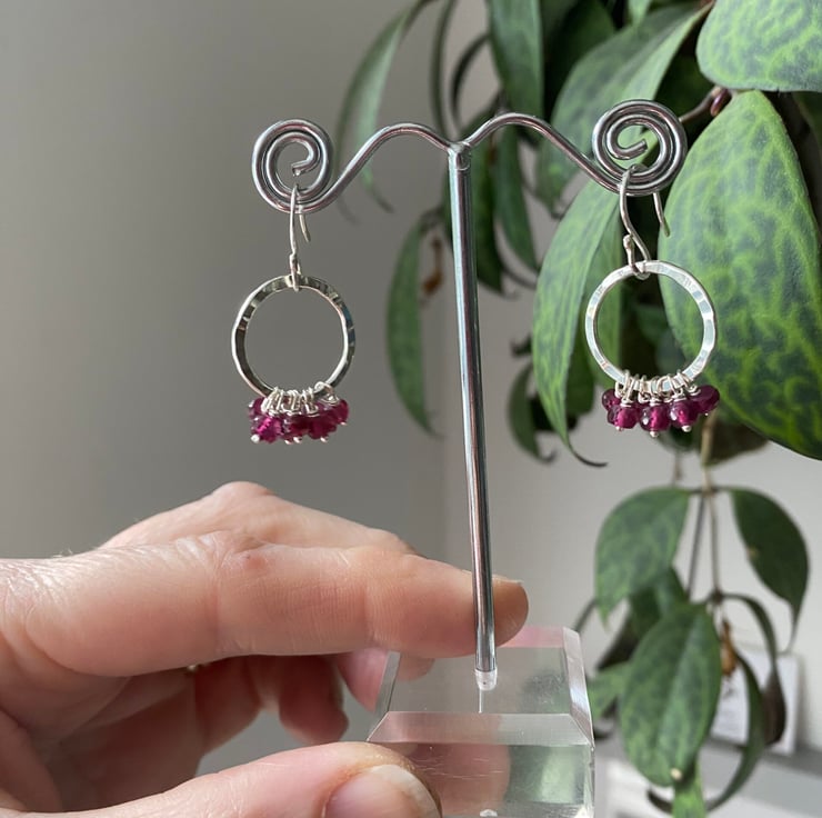 Super Disco Ruffle earrings. Each with 7 garnet gemstones daintily strung onto a handmade silver disco circle with sterling silver wires. Larger than our original disco ruffle earrings.