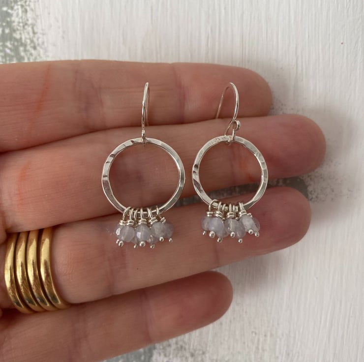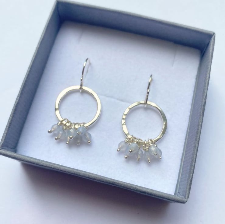 Super Disco Ruffle earrings. Each with 7 aquamarine gemstones daintily strung onto a handmade silver disco circle with sterling silver wires. Larger than our original disco ruffle earrings.