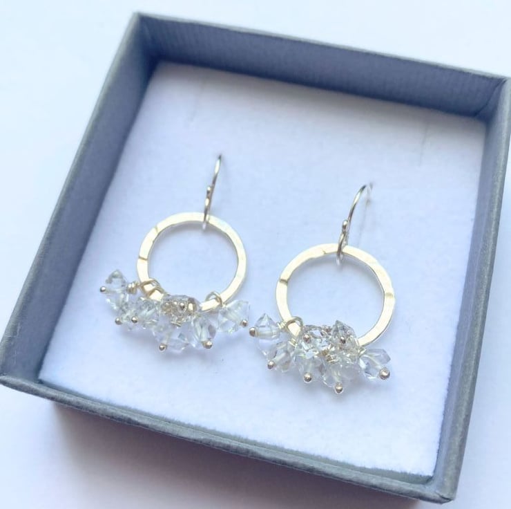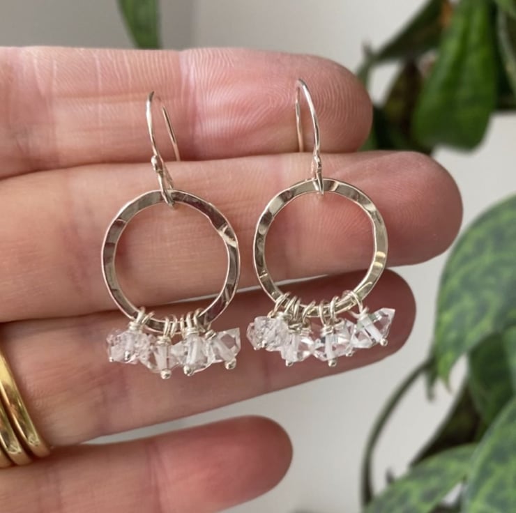 Super Disco Ruffle earrings. Each with 7 Herkimer diamond gemstones daintily strung onto a handmade silver disco circle with sterling silver wires. Larger than our original disco ruffle earrings.