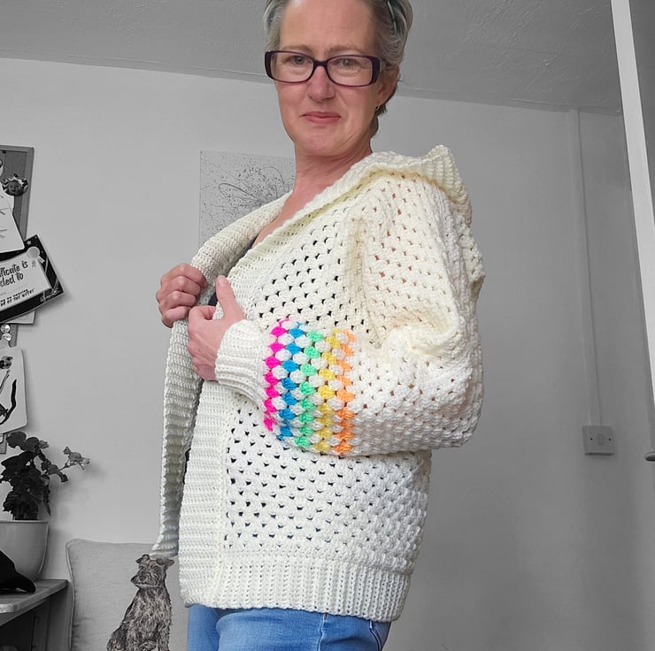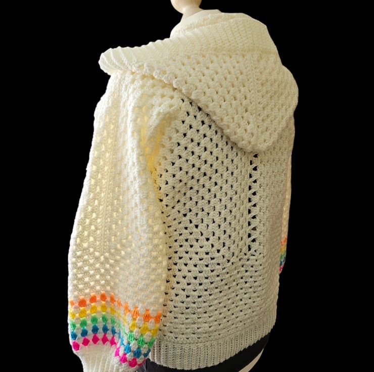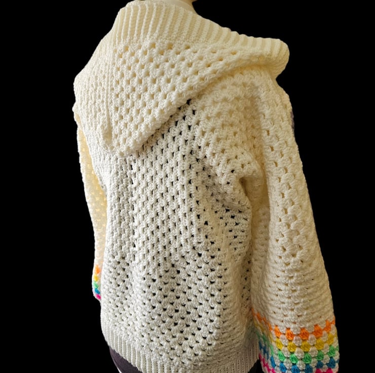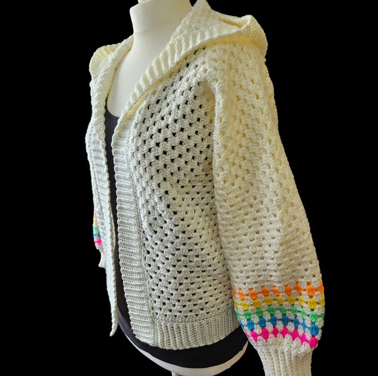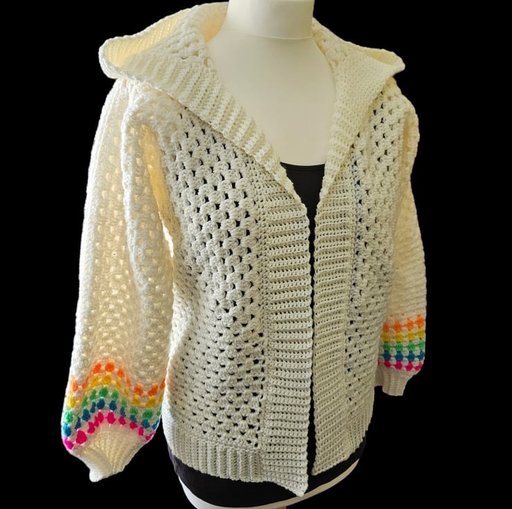 This exquisite soft cream cardigan features a delightful pop of color on the sleeves and beautiful ribbed detailing. It is crafted from 100% premium acrylic yarn and is machine washable.